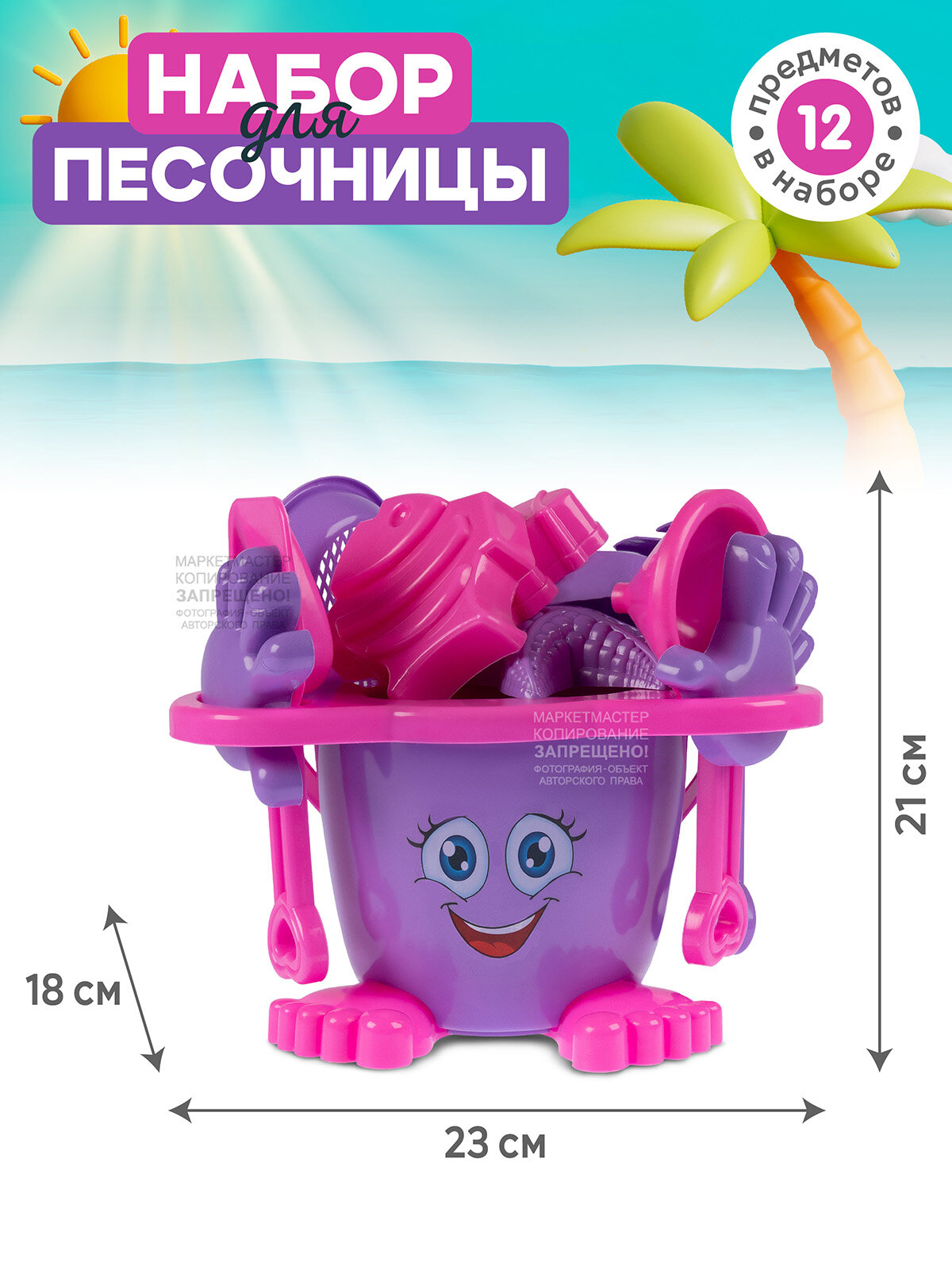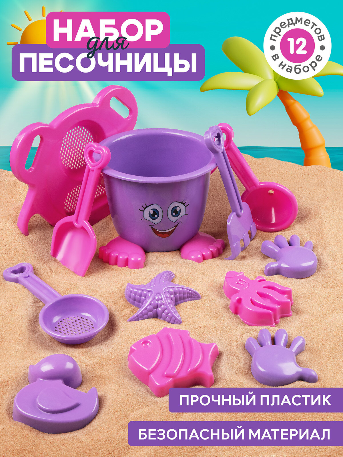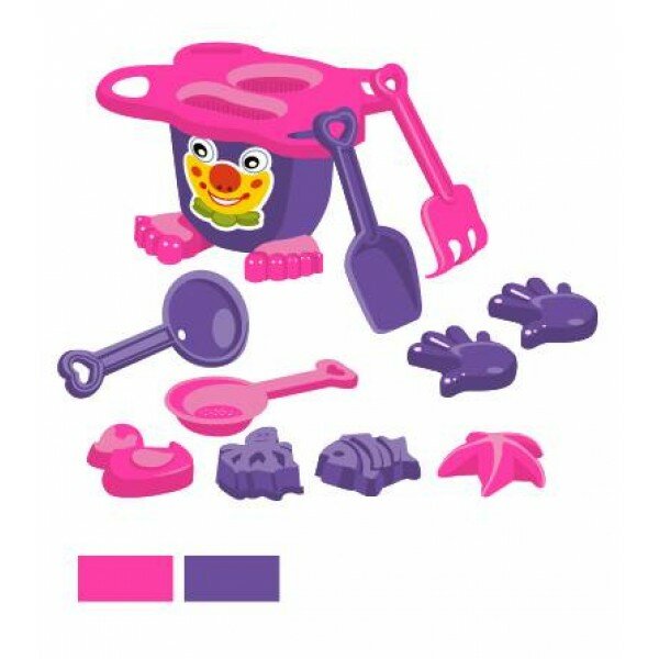 Компания Друзей Песочный набор "Человечек" фиолетово-розовый (в комп. ведро 1,2 л, лопатка, грабли, воронка, сито 17 см, 4 формочки 9 см) 23х21х18 см JB5300629