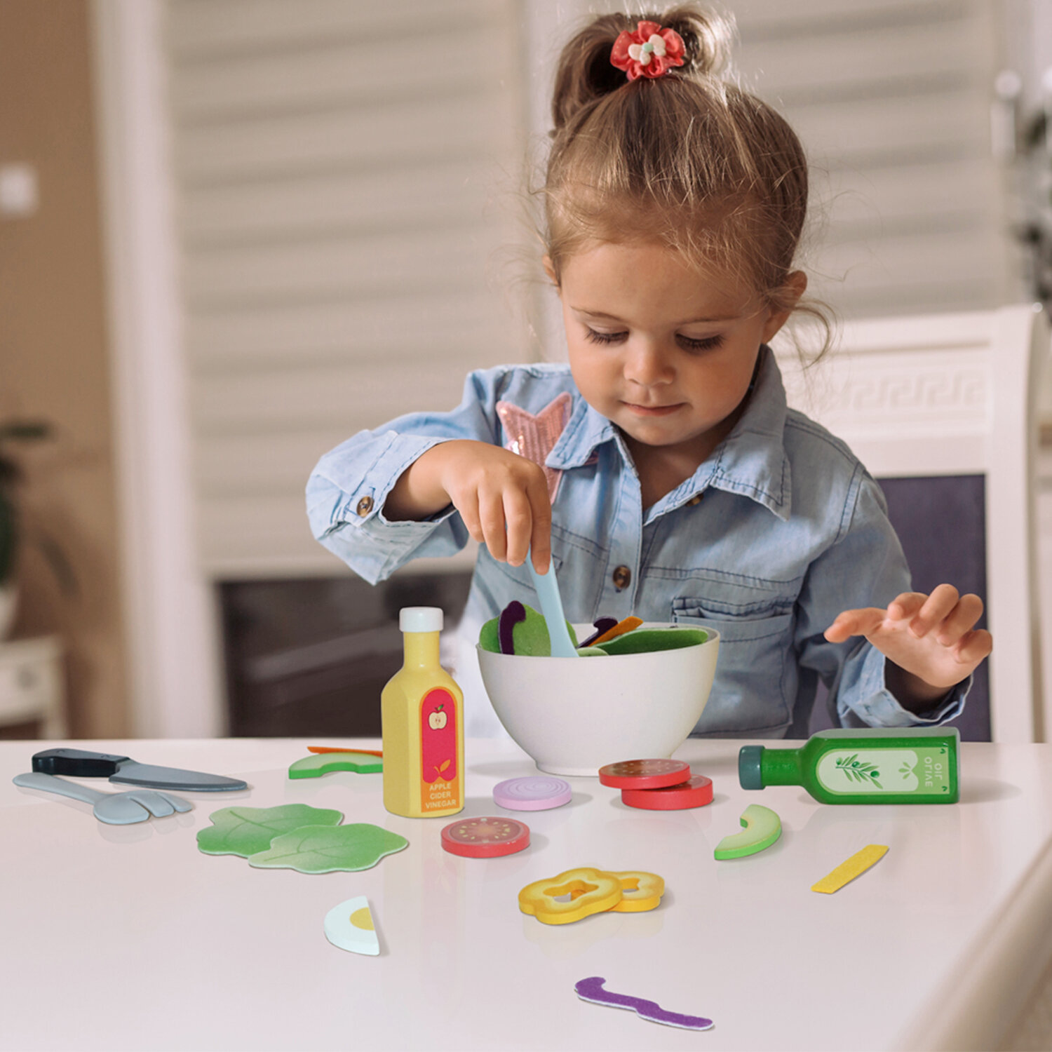 | Комплектация | Деревянные: 2 бутылки, 3 помидора, 3 луковицы,3 огурца, 3 авокадо, 3 яйца, 3 желтых перца. Войлок: 3 листа, 6 морковок, 6 кусочков фиолетовой капусты. Пластик: миска, нож, ложка, вилка |