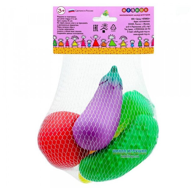 | Дополнительная информация | размеры игрушек: кукуруза: 47х44х131, помидор: 73х73х53, огурец: 113х47х41, баклажан: 110х48х50 |
