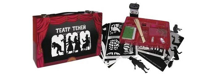| Комплектация | - большой светодиодный фонарь для сцены (3 элемента питания АА; в набор не входят); - 2 маленьких фонарика для декора; - набор из 24 фигурок; - 40 деревянных палочек для вождения фигурок; - 40 скрепок; - комплект декораций, афиши, билеты, монеты; - 6 кнопок-братс для фигурок; - цветные кальки, 1 белая калька для экрана; - книга со сценариями 66 страниц; - книга «ТЕАТР ТЕНЕЙ» 24 стр. с цветными иллюстрациями. |