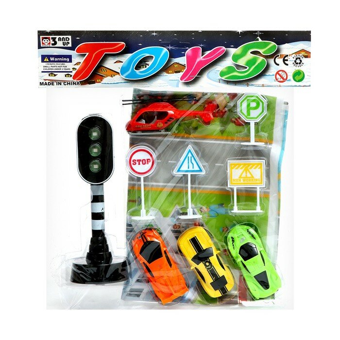 Игровой набор «Дорожные знаки», в наборе игровое поле, знаки, 3 машинки, вертолет, цвет микс интересное: