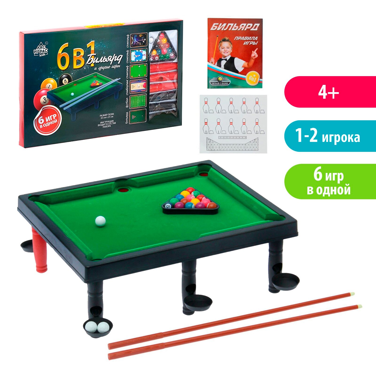 Настольный бильярд "6в1: бильярд, стикбол, стикбоулинг, стик гольф, фингербол" интересное: