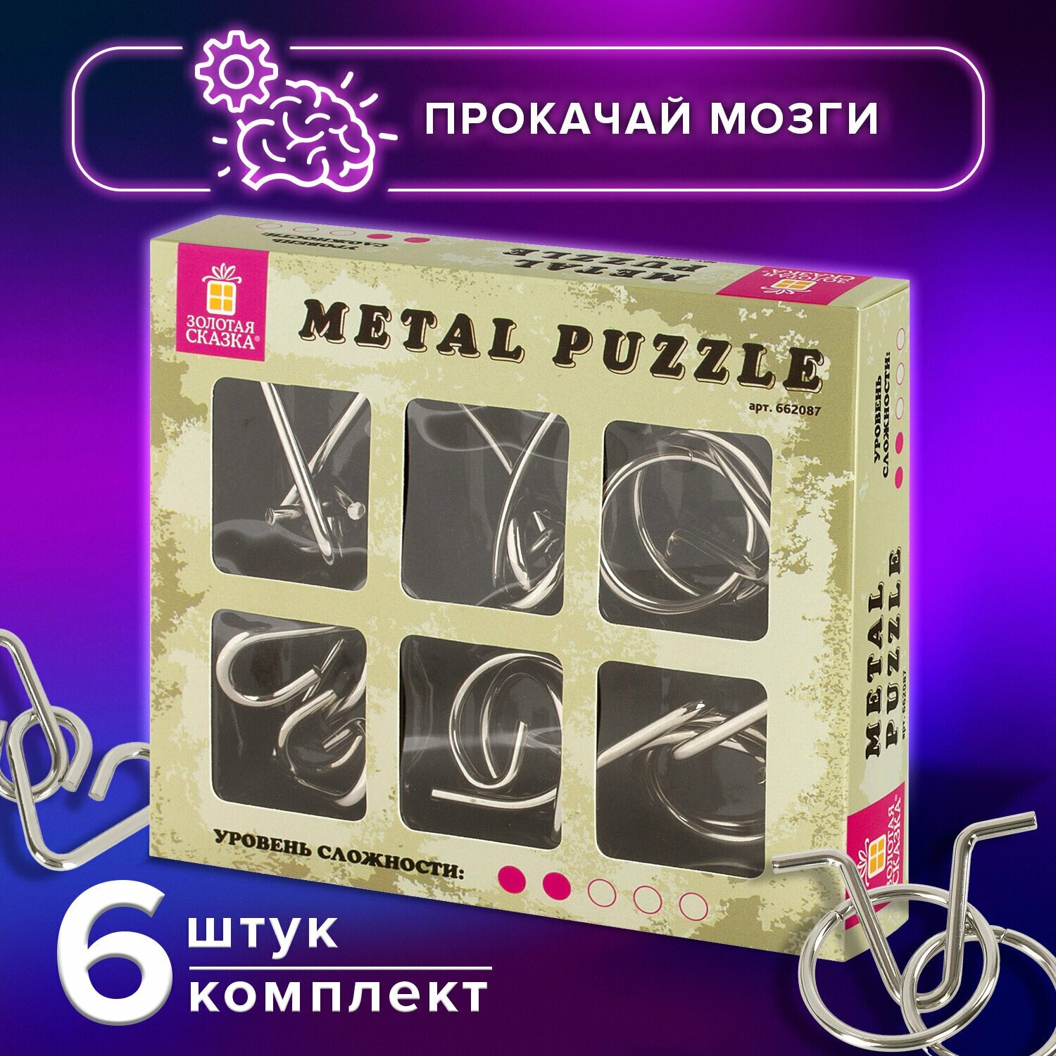 Головоломки металлические для взрослых и детей Золотая Сказка (уровень сложности Новичок), набор 6 штук, 662087