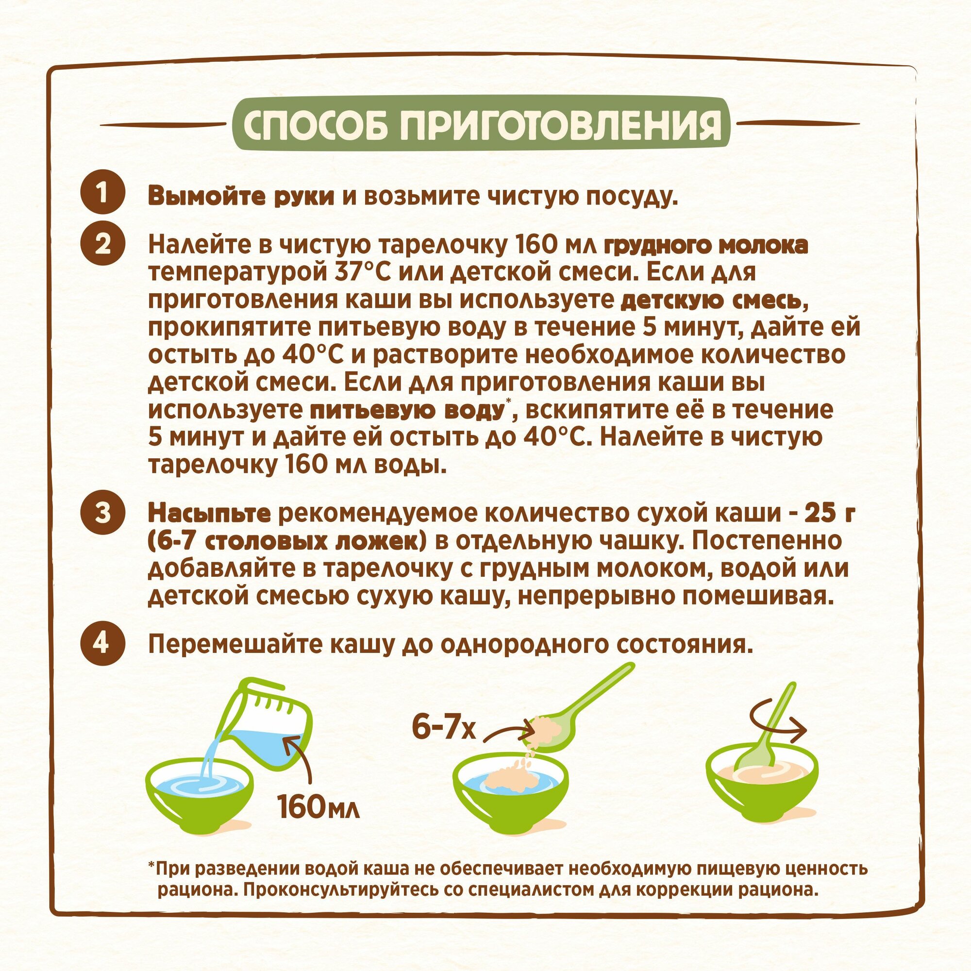 | Дополнительная информация | продукт может содержать молоко; продукт упакован в модифицированной атмосфере с азотом; условия хранения: закрытую пачку хранить в сухом месте при температуре не более 25 ℃ и относительной влажности воздуха не более 75 %, после приготовления каши вскрытый пакет следует плотно закрыть, после вскрытия упаковки продукт следует хранить не более 2-х недель; содержит пробиотик |