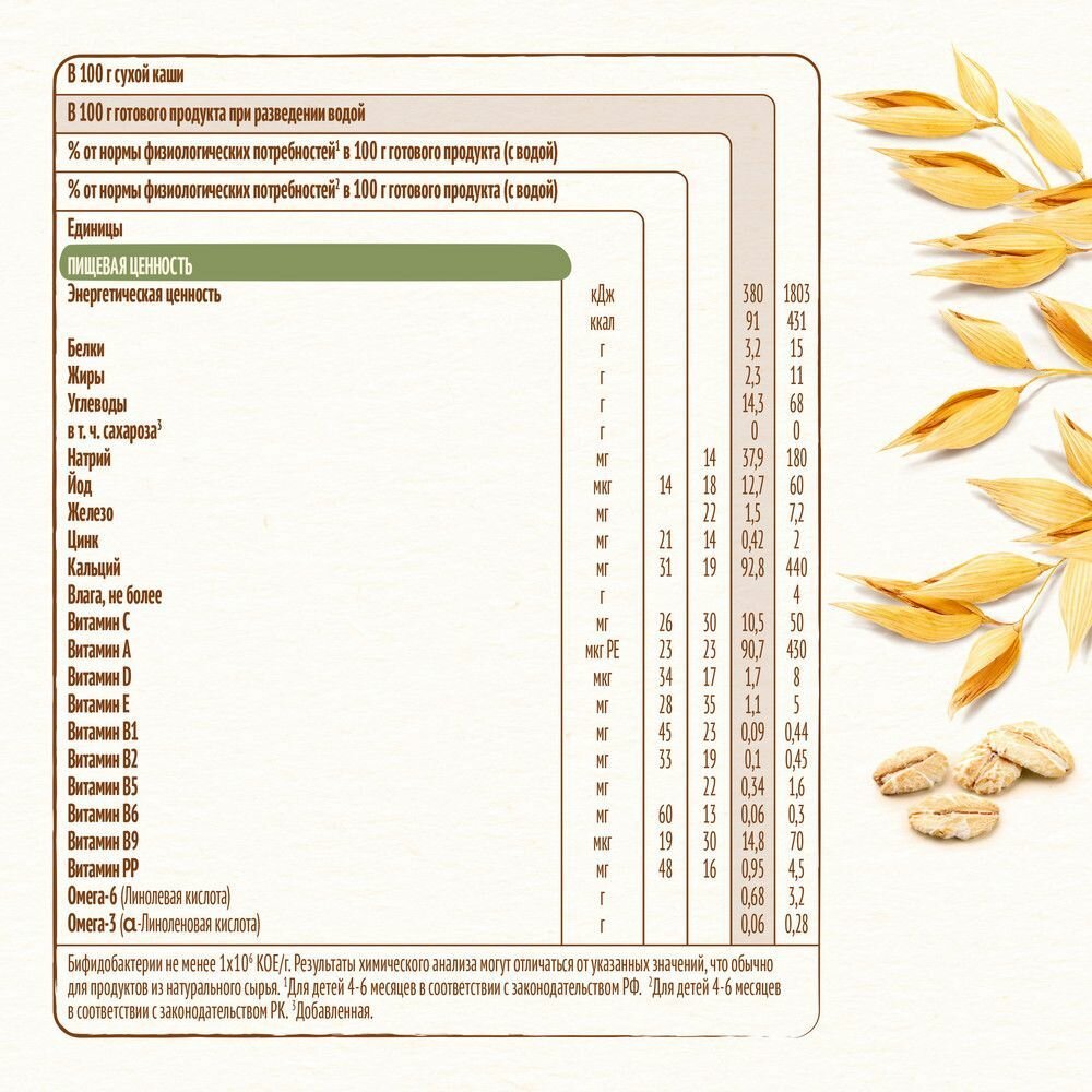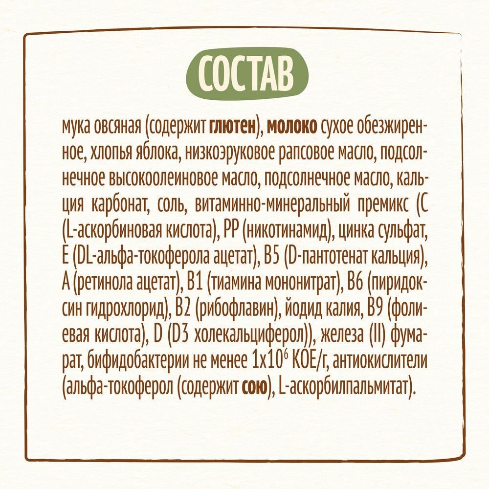 | Состав | мука овсяная (70,3 %) (содержит глютен), молоко сухое обезжиренное (18,1 %), смесь растительных масел (низкоэруковое рапсовое, подсолнечное высокоолеиновое, подсолнечное, антиокислители (L-аскорбилпальмитат, альфа-токоферол, лимонная кислота), хлопья яблока (4,1 %) (яблоко, крахмал кукурузный, мальтодекстрин), сахар, минеральные вещества (кальция карбонат, железа (II) фумарат, цинка сульфат, йодид калия), витамины (С (L-аскорбиновая кислота), E (DL-альфа-токоферола ацетат), РР (никотинамид), B5 (D-пантотенат кальция), A (ретинола ацетат), В1 (тиамина мононитрат), В6 (пиридоксин гидрохлорид), В2 (рибофлавин), B9 ( фолиевая кислота), D (D3 холекальциферол)), бифидобактерии не менее 1х10^6 КОЕ/г |