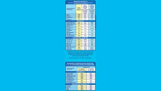 | Состав | молоко коровье нормализованное, мука рисовая, масло кукурузное, сахар, минеральные вещества: кальция лактат, натрия цитрат,железа глюконат, йодид калия; витамины: С (L-аскорбиновая кислота), РР (никотинамид), Е (DL-альфа токоферол ацетат), А (ретинола пальмитат), В 1 (тиамина гидрохлорид), В 2 (рибофлавин), Д 3 (холекальциферол) |