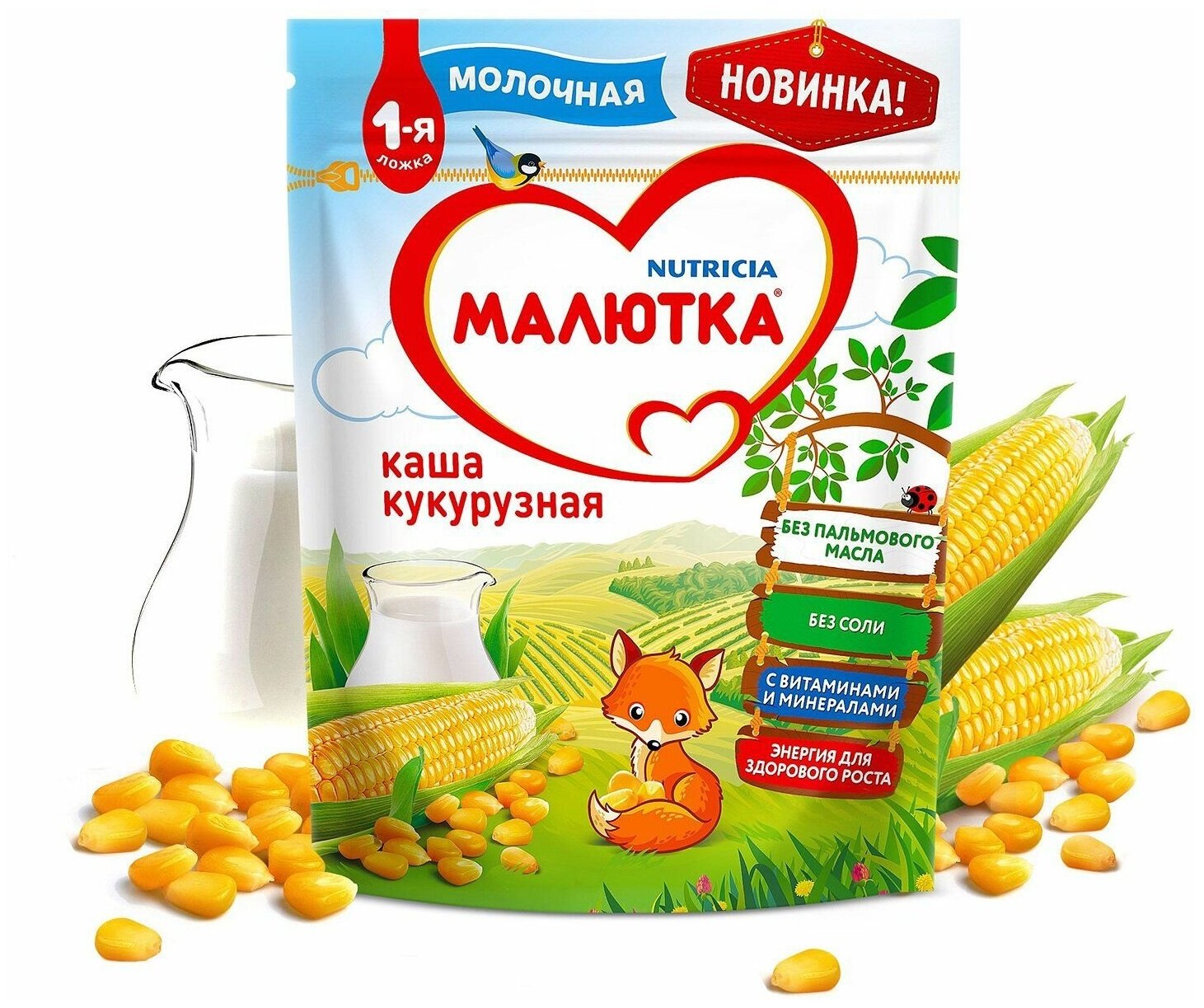 | Состав | мука кукурузная, сухая молочная основа (молоко обезжиренное, смесь растительных масел (пальмовое, рапсовое, кокосовое, подсолнечное, эмульгатор соевый лецитин)), сахар, мальтодекстрин, витаминно-минеральный премикс (содержит минералы (Ca, Fe, Zn, Cu, I), витамины (С, Е, ниацин, А, D3, К, пантотеновую кислоту, В12, В1, биотин, В6, фолиевую кислоту, В2)) |