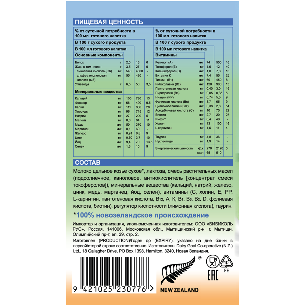 | Состав | молоко цельное козье сухое, лактоза, смесь растительных масел (подсолнечное, каноловое, антиокислитель [концентрат смеси токоферолов]), минеральные вещества (кальций, натрий, железо, цинк, медь, марганец, йод, селен), витамины (С, холин, Е, PP, L-карнитин, пантотеновая кислота, В12, А, К, В1, В6, В2, D, фолиевая кислота, биотин), регулятор кислотности (лимонная кислота), таурин |