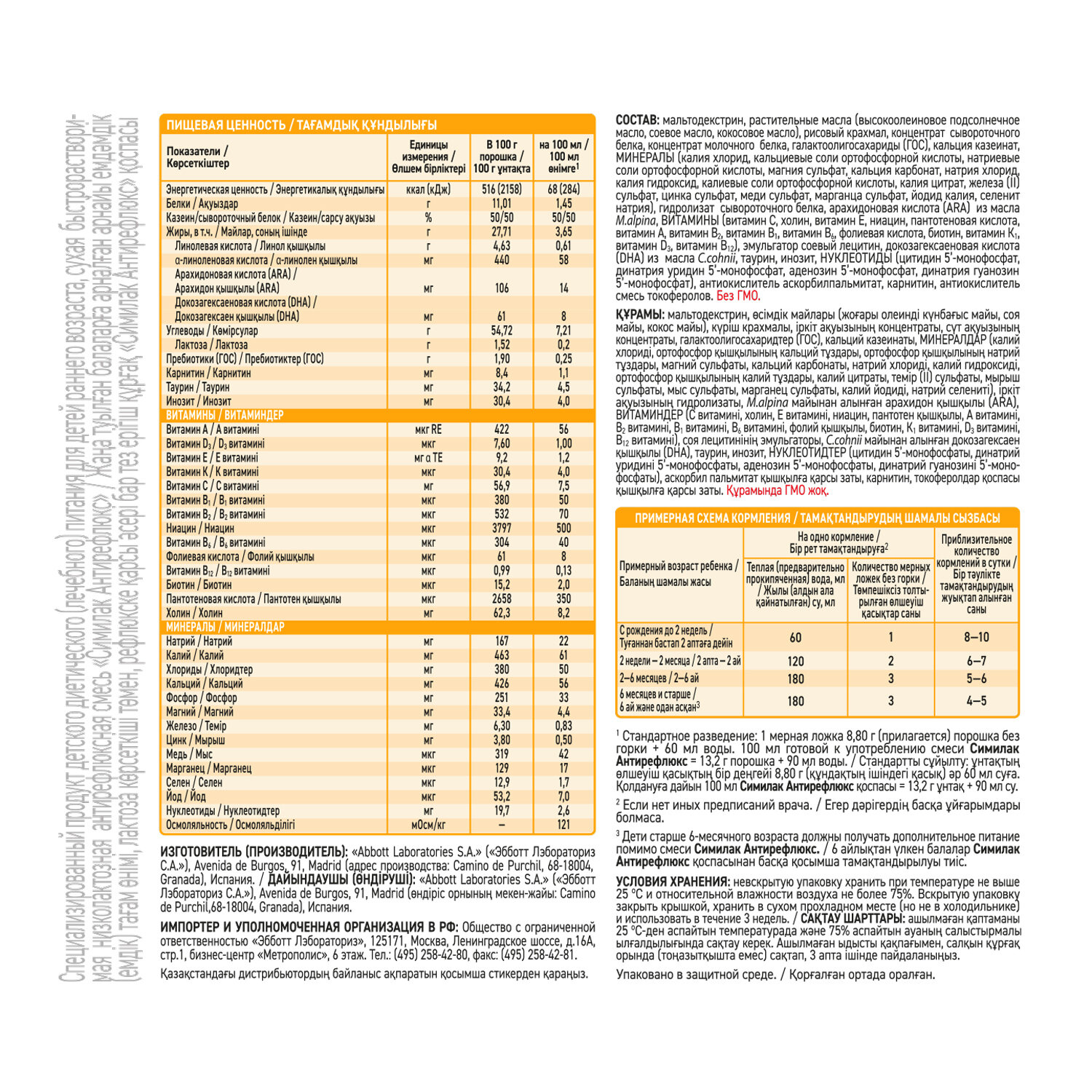 | Состав | мальтодекстрин, растительные масла (высокоолеиновое подсолнечное масло, соевое масло, кокосовое масло), рисовый крахмал, концентрат сывороточного белка, концентрат молочного белка, галактоолигосахариды (ГОС), кальция казеинат, минералы, гидролизат сывороточного белка, арахидоновая кислота (AA) из масла M. alpina, эмульгатор соевый лецитин, докозагексаеновая кислота (DHA) из масла C. cohnii, таурин, m-инозитол, витамины, нуклеотиды (цитидин 5'- монофосфат, динатрия уридин 5'-монофосфат, аденозин 5'-монофосфат, динатрия гуанозин 5'-монофосфат), l-карнитин |