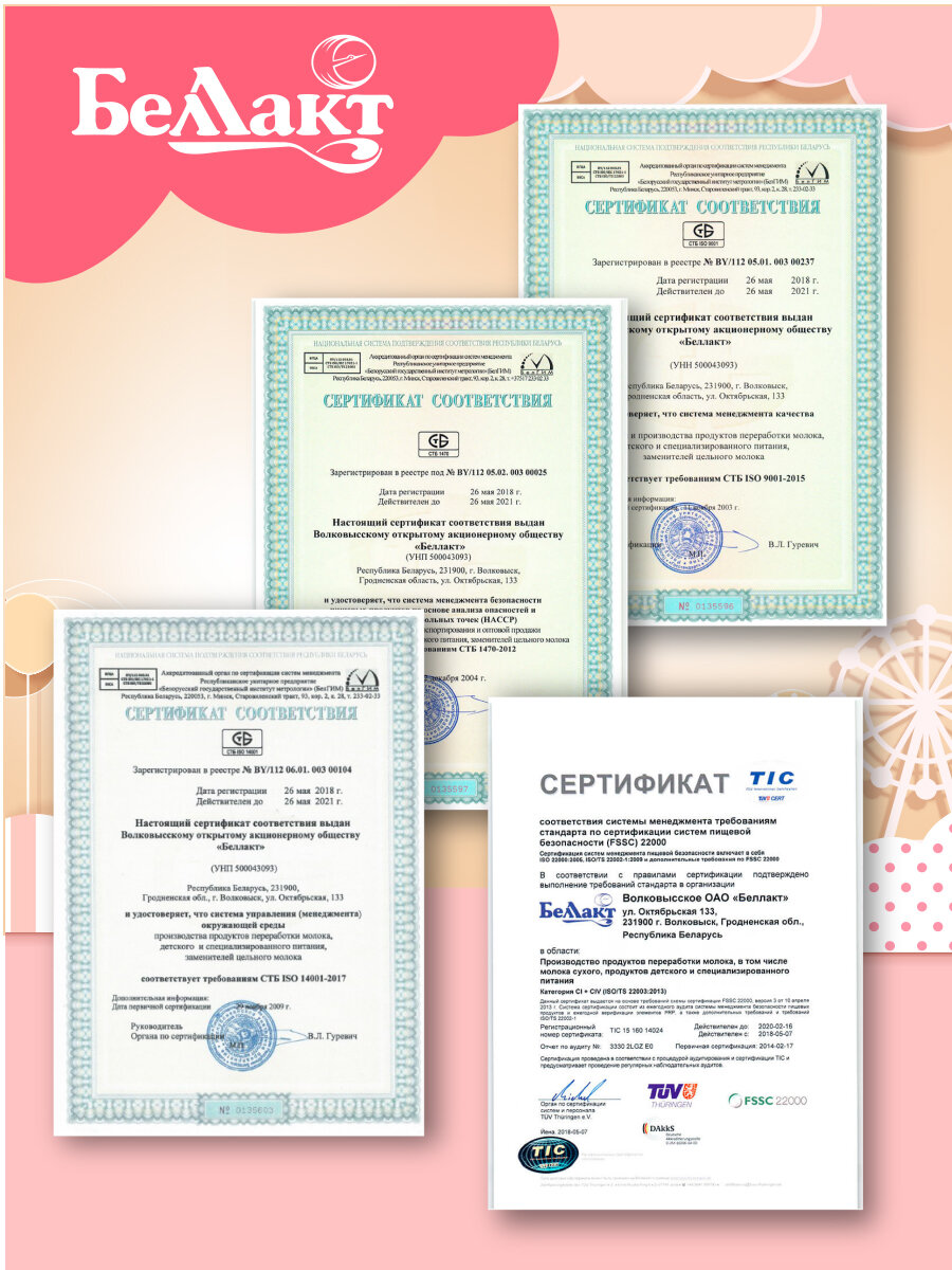 | Состав | молоко обезжиренное, лактоза, сливки, растительные масла: высокоолеиновое подсолнечное, соевое, кокосовое; мальтодекстрин, пребиотики: олигогалактоза (ГОС), олигофруктоза (ФОС); концентрат сывороточных белков, масло, содержащее докозагексаеновую кислоту DHA (рафинированный рыбий жир, смесь токоферолов, аскорбил пальмитат), минеральные вещества; витаминный премикс; витаминно-аминокислотный премикс: инозит, L–карнитин, холин; лютеин, минеральный премикс, нуклеотидный премикс: цитидин-5'-монофосфат, уридин-5'-монофосфат, гуанозин-5'-монофосфат, аденозин-5'-монофосфат, инозин-5'-монофосфат; бактериальный концентрат бифидобактерий Bifidobacterium lactis BB-12 |