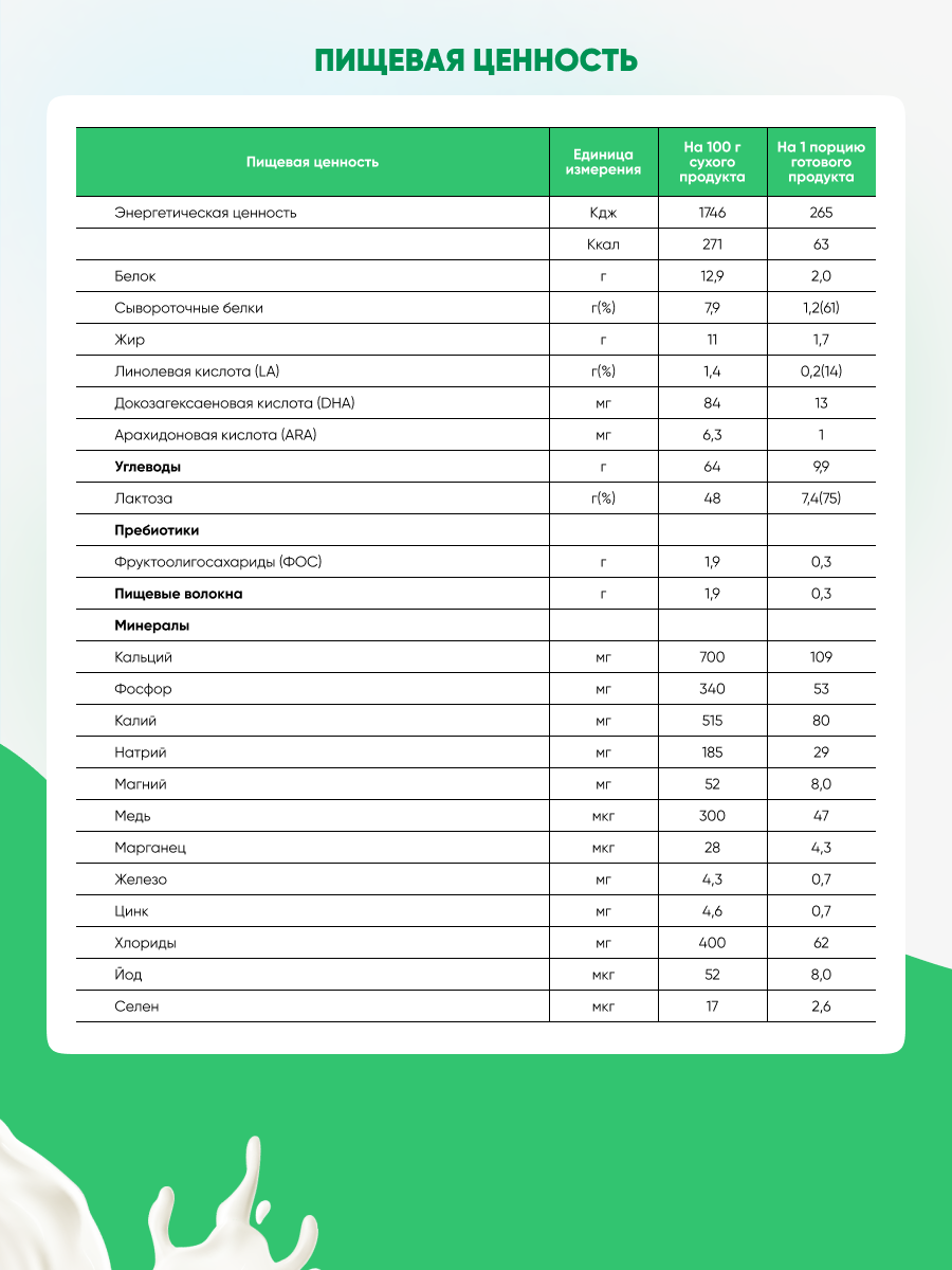| Состав | Cухое цельное козье молоко, лактоза, сухая сыворотка козьего и овечьего молока, сухой кукурузный сироп глюкозы, смесь растительных масел (рапсовое масло с низким содержанием эруковой кислоты, высокоолеиновое подсолнечное масло), фруктоолигосахариды (ФОС), докозагексаеновая кислота (DHA), эмульгатор (рапсовый лецитин), минералы (оксид магния, хлорид калия, лактат кальция, цитрат калия, лактат железа, лактат цинка, сульфат меди, йодид натрия, сульфат марганца, селенит натрия), витамины (L-аскорбиновая кислота, никотинамид, DL-альфа-токоферол ацетат, D-пантотенат, рибофлавин, пиридоксина гидрохлорид, тиамина мононитрат, фолиевая кислота, D-биотин, цианокобаламин, ретинилпальмитат, филлохинон, холекальциферол), холин, инозитол, нуклеотиды (цитидин 5'-монофосфат, уридин 5'-монофосфат, аденозин 5'-монофосфат, инозин 5'-монофосфат,гуанозин 5'-монофосфат), таурин |