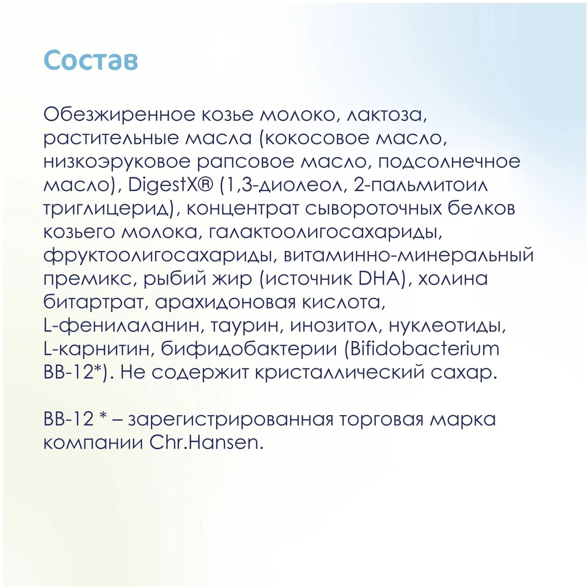 | Состав | Обезжиренное козье молоко, лактоза , растительные масла (кокосовое масло, низкоэруковое рапсовое масло, подсолнечное масло), DigestX (1,3-диолеол 2-пальмитоил триглицерид), концентрат сывороточных белков козьего молока, галактоолигосахариды, фруктоолигосахариды, витаминно - минеральный премикс, рыбий жир (источник DHA), холина битартрат, арахидоновая кислота, L-фенилаланин, таурин, инозитол, нуклеотиды, L-карнитин, бифидобактерии (Bifidobacterium BB-12). Не содержит кристаллический сахар. |