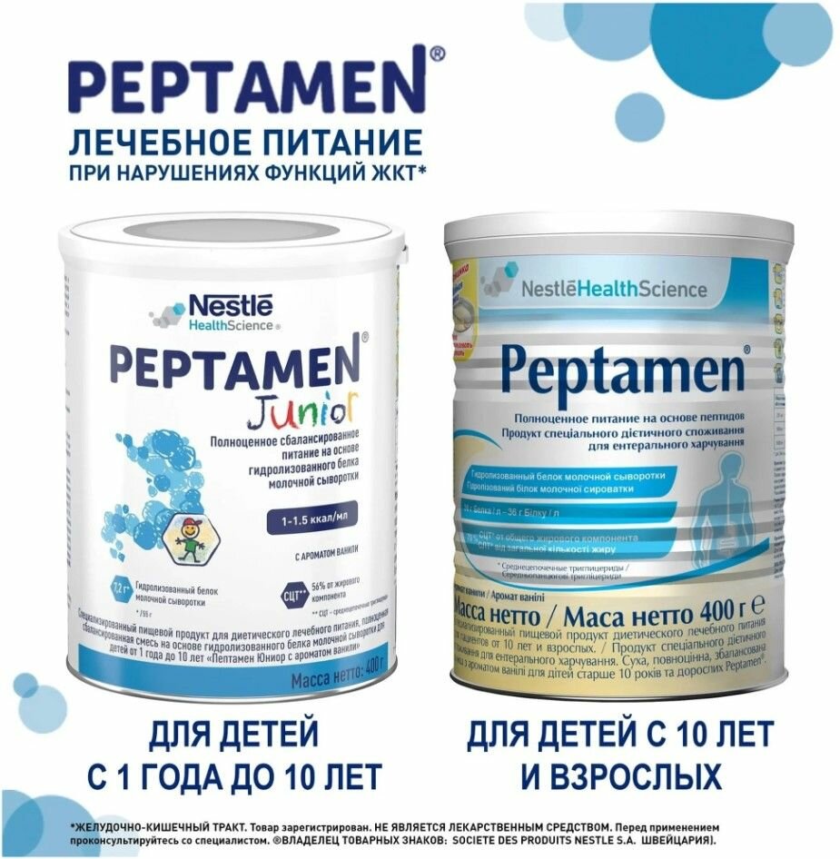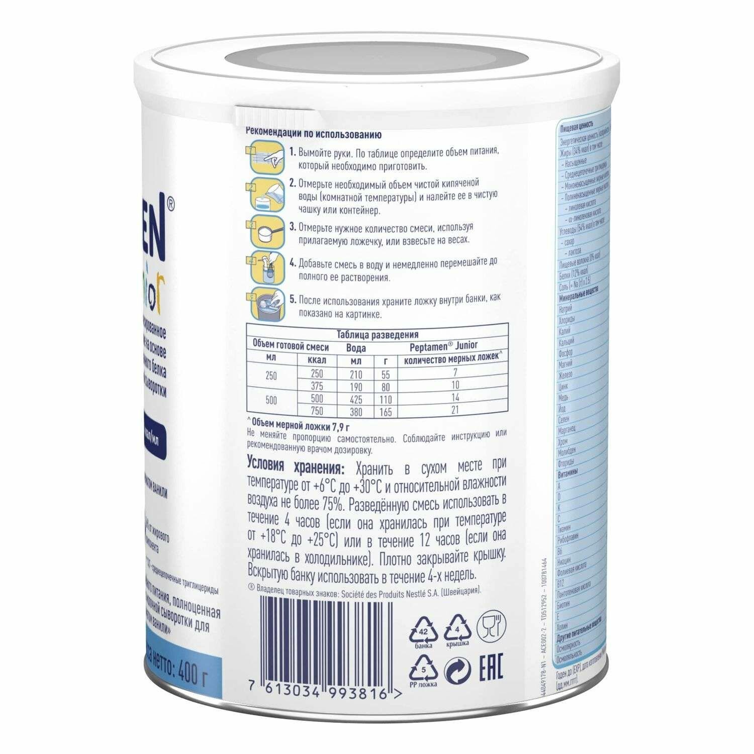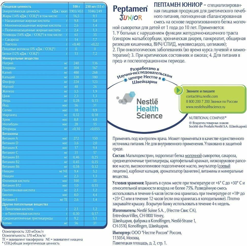 | Дополнительная информация | Смесь Пептамен предназначена для перорального или зондового питания. Рекомендации по применению Вымыть руки. По таблице определить объем питания, который необходимо приготовить. Отмерить необходимый объем чистой кипяченой воды (комнатной температуры) и налить ее в чистую чашку или контейнер. Отмерить нужное количество смеси, используя прилагаемую ложечку, или взвесить на весах. Добавить смесь в воду и немедленно перемешать до полного ее растворения. После использования хранить ложку внутри банки. После приготовления смеси банку с порошком следует плотно закрыть. |