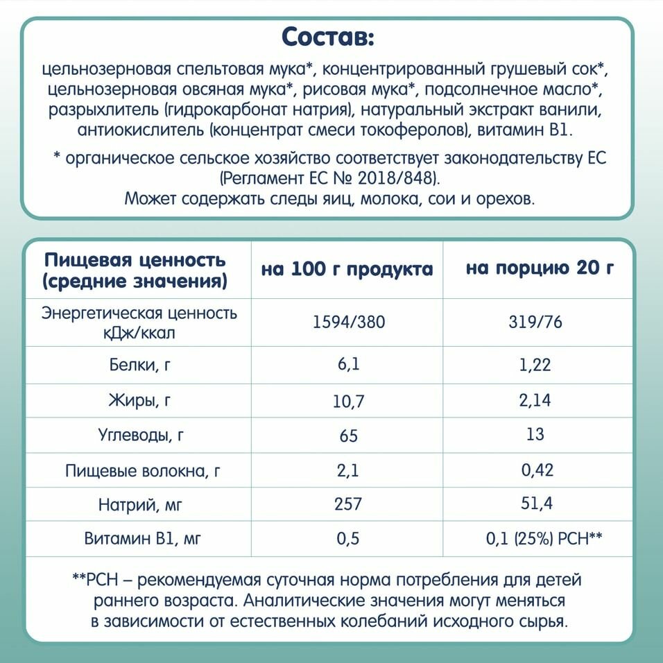 | Состав | цельнозерновая спельтовая мука*, концентрированный грушевый сок*, цельнозерновая овсяная мука*, рисовая мука*, подсолнечное масло*, разрыхлитель (гидрокарбонат натрия), натуральный экстракт ванили, антиокислитель (концентрат смеси токоферолов), витамин В1 *органическое сельское хозяйство соответствует законодательству ЕС (Регламент ЕС №2018/848) |