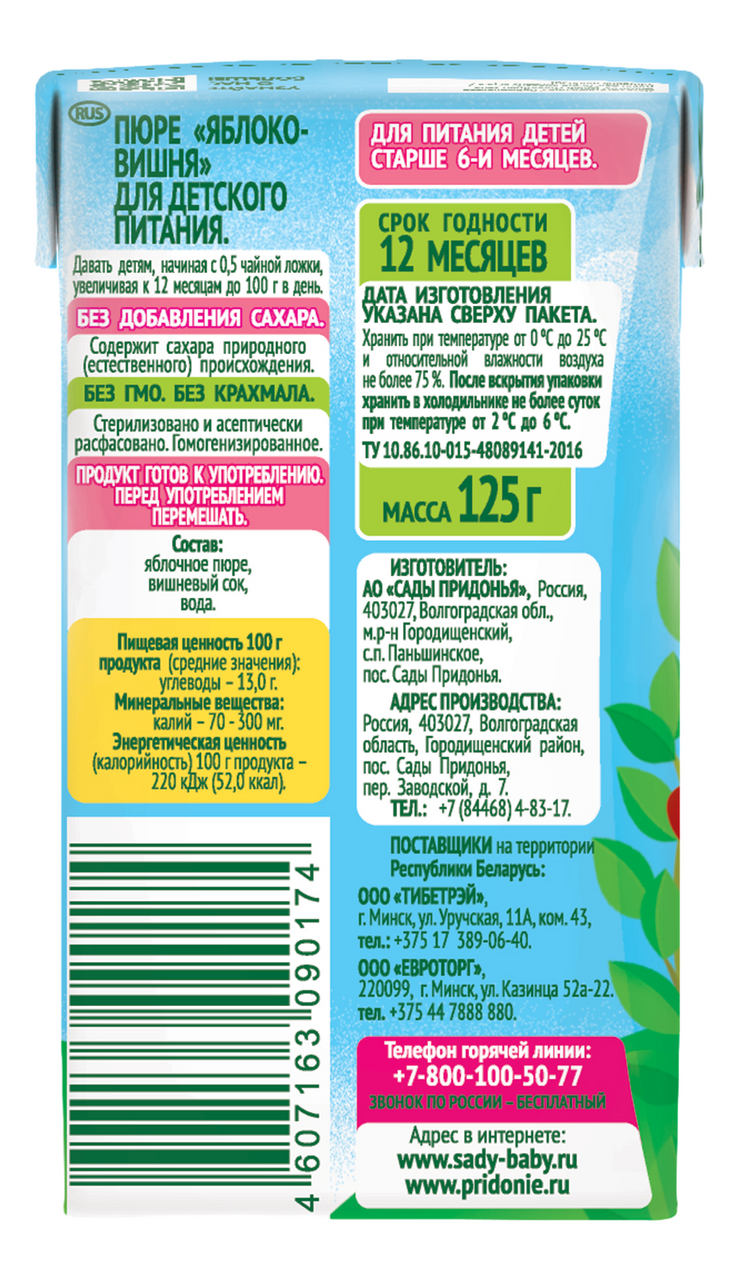 Детское пюре "Сады Придонья" яблоко-вишня пак 125г интересное: