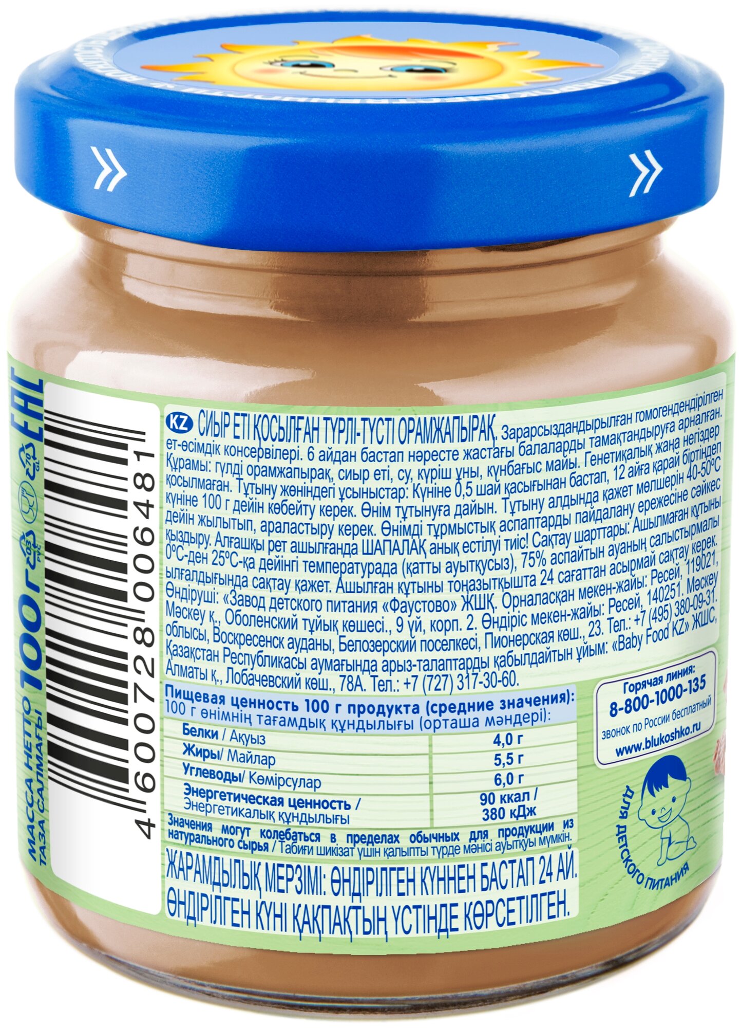 | Состав | цветная капуста, говядина, мука рисовая, масло подсолнечное, вода питьевая |
