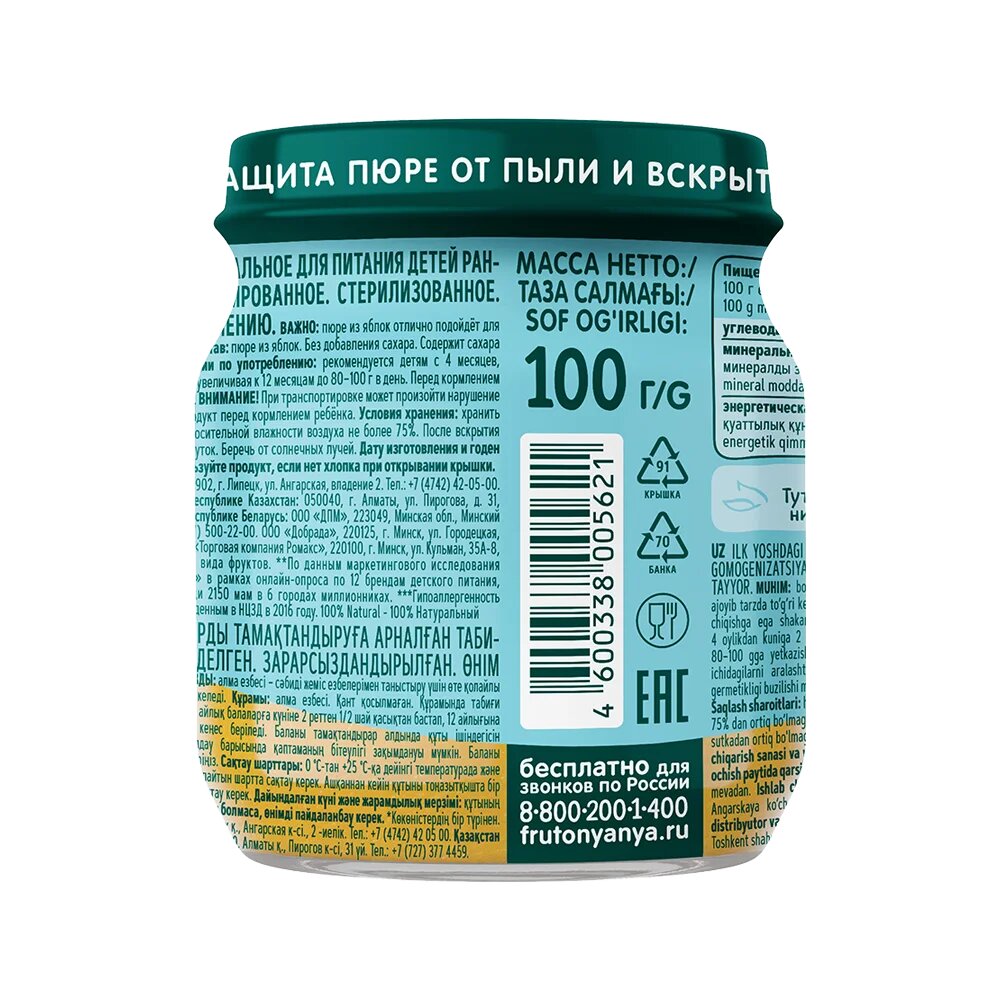 Пюре фруктовое ФрутоНяня с 4 месяцев, яблоко, 100 г. 6 шт интересное: