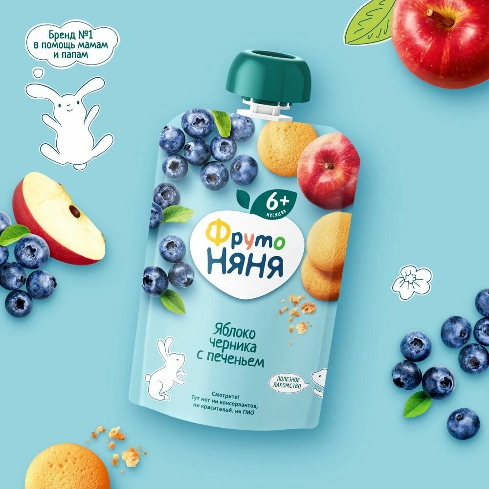 Пюре ФрутоНяня из яблок и черники с печеньем 90г с 6 месяцев, 6 шт интересное: