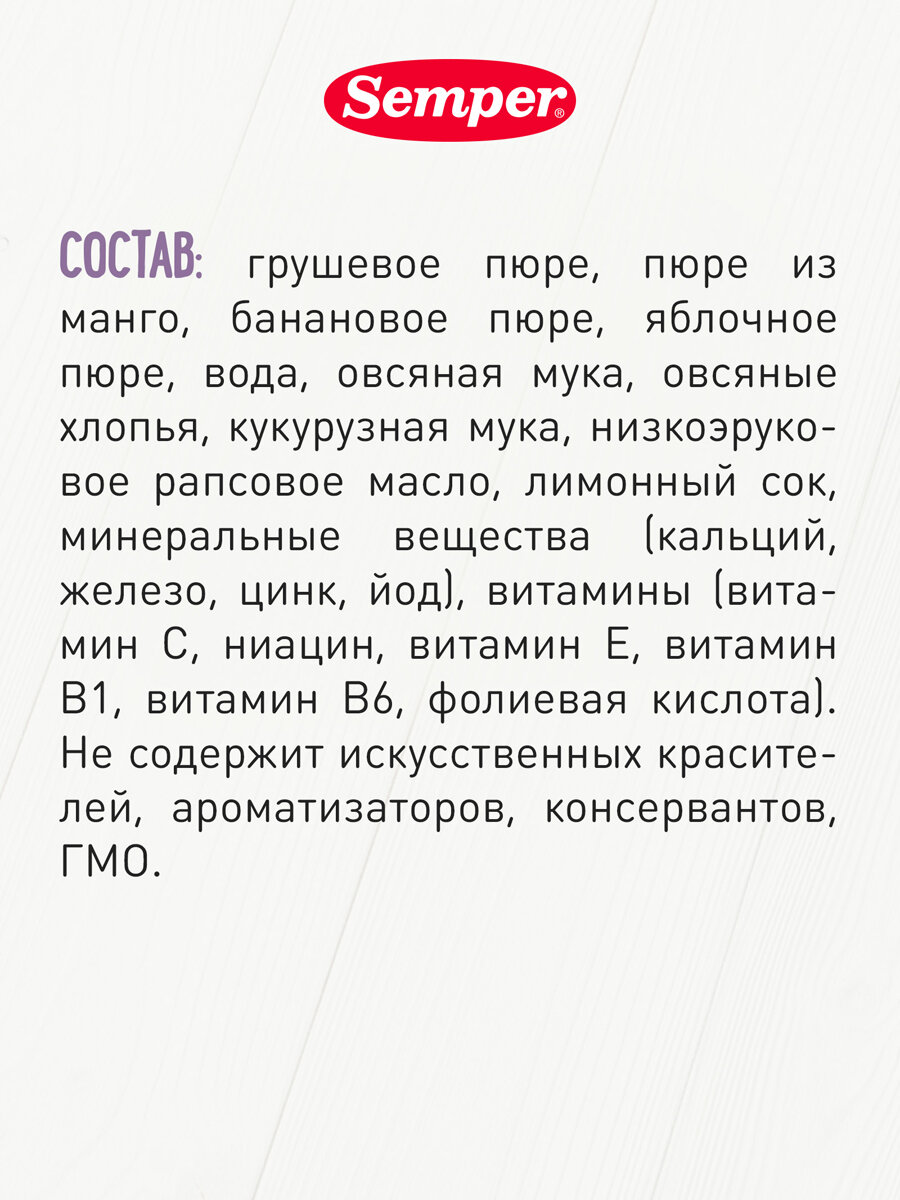 | Состав | грушевое пюре, пюре из манго, банановое пюре, яблочное пюре, вода, овсяная мука, овсяные хлопья, кукурузная мука, низкоэруковое рапсовое масло, лимонный сок, минеральные вещества (кальций, железо, цинк, йод), витамины (витамин С, ниацин, витамин Е, витамин В1, витамин В6, фолиевая кислота) |