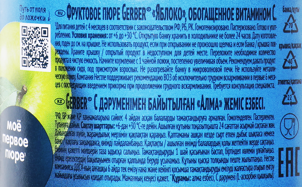 GERBER Пюре Фруктовое Яблоко {c 4 мес} 1-я ступень 125г. интересное: