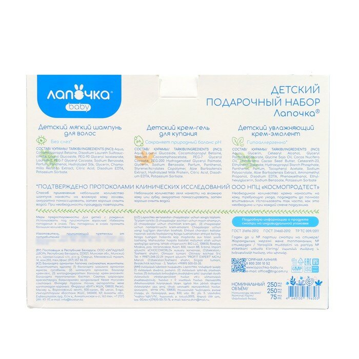 | Подробная комплектация | Мягкий шампунь; Крем-эмолент для тела; Крем-гель для купания |