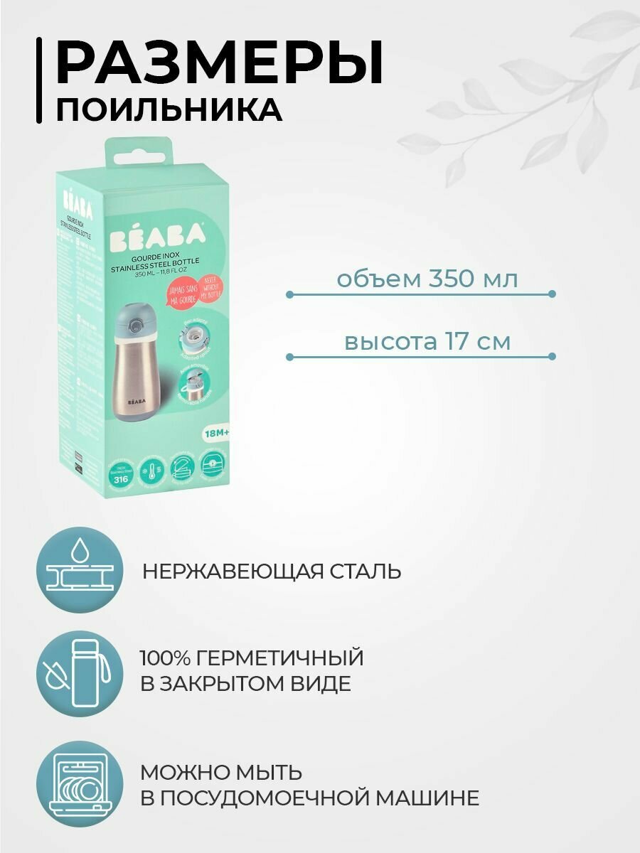 Поильник термос детский BEABA с крышкой, адаптированным носиком, съемной ручкой, термос детский для воды 350 мл., зеленый, эвкалипт