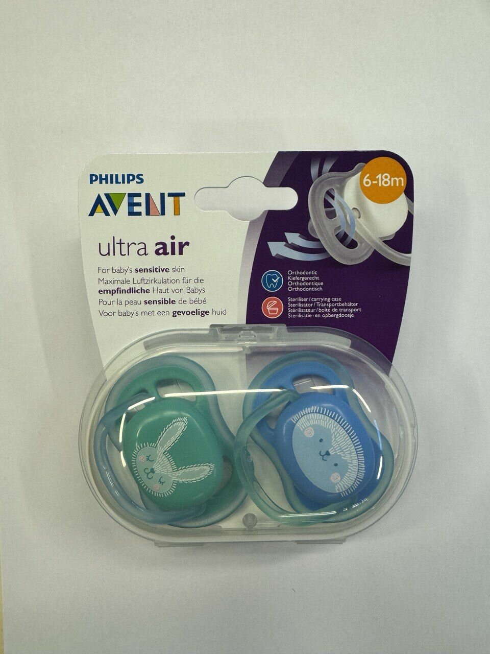 Силиконовые пустышки Philips Avent SCF085/16 ultra air 2 шт, с широкими воздушными отверстиями, контейнером для стерилизации, фиолетовый/зеленый