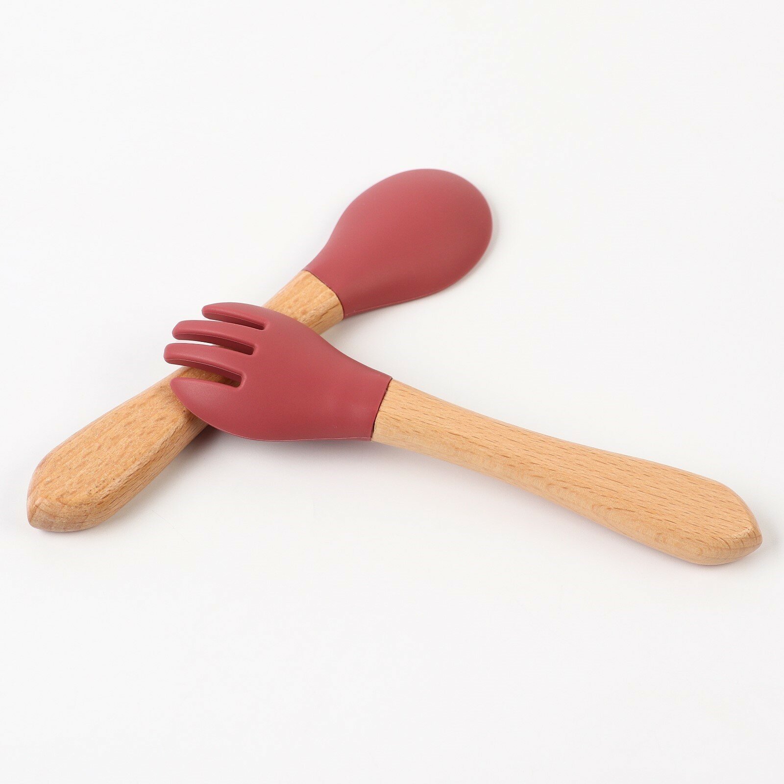Купить Набор детский столовых приборов, вилка и ложка M&B (силикон, бамбук), вишня