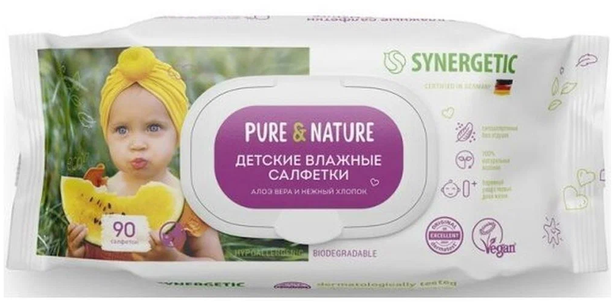 Детские влажные салфетки SYNERGETIC Pure&Nature «Алоэ вера и нежный хлопок» без отдушек, гипоаллергенные, биоразлагаемые, для новорожденных 0+, 60 шт.