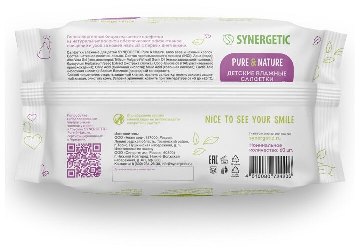 Детские влажные салфетки SYNERGETIC Pure&Nature «Алоэ вера и нежный хлопок» без отдушек, гипоаллергенные, биоразлагаемые, для новорожденных 0+, 60 шт.