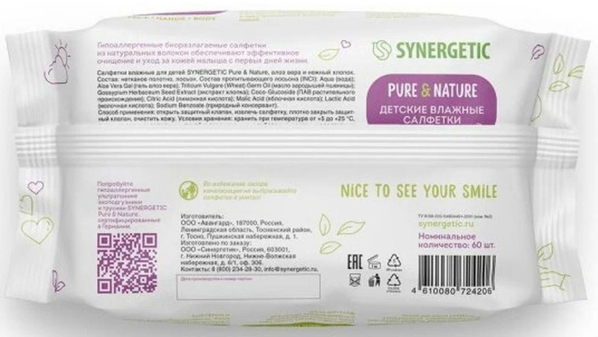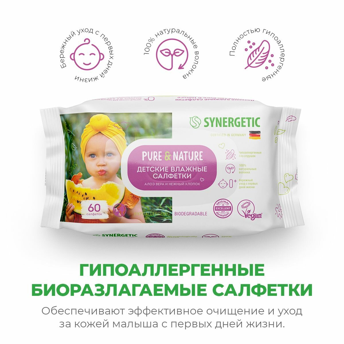 Детские влажные салфетки SYNERGETIC Pure&Nature «Алоэ вера и нежный хлопок» без отдушек, гипоаллергенные, биоразлагаемые, для новорожденных 0+, 60 шт.