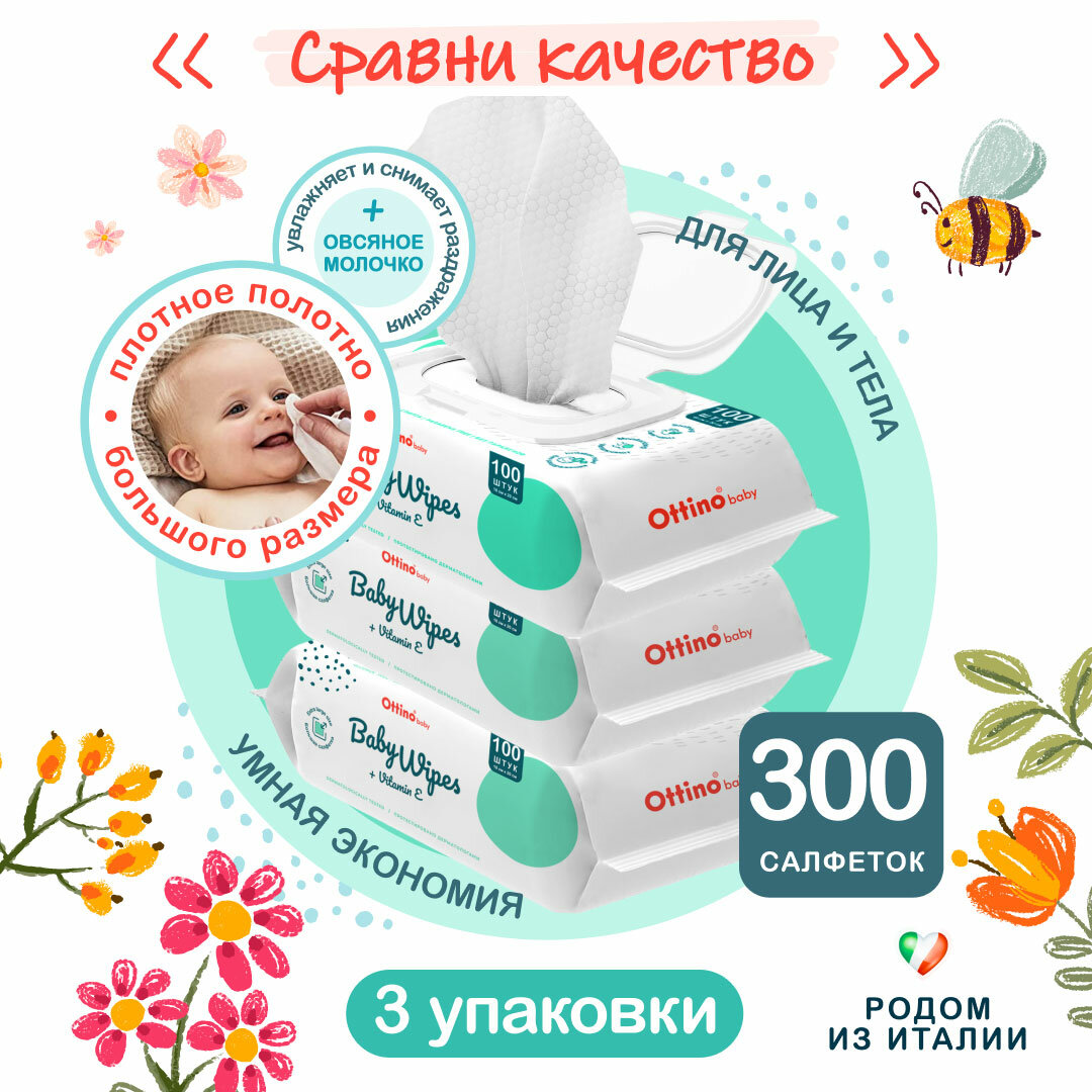 Влажные салфетки для детей OTTINO /оттино/ 300 шт, набор из 3 уп по 100 шт интересное: