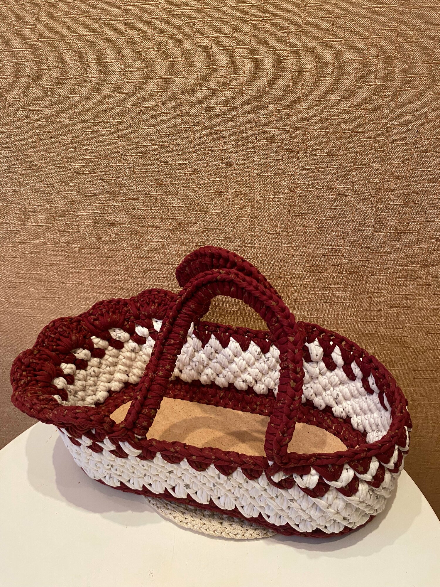 Люлька, переноска, кроватка для куклы вязаная Хлопок цвет глинтвейн с золотыми звездочками интересное: