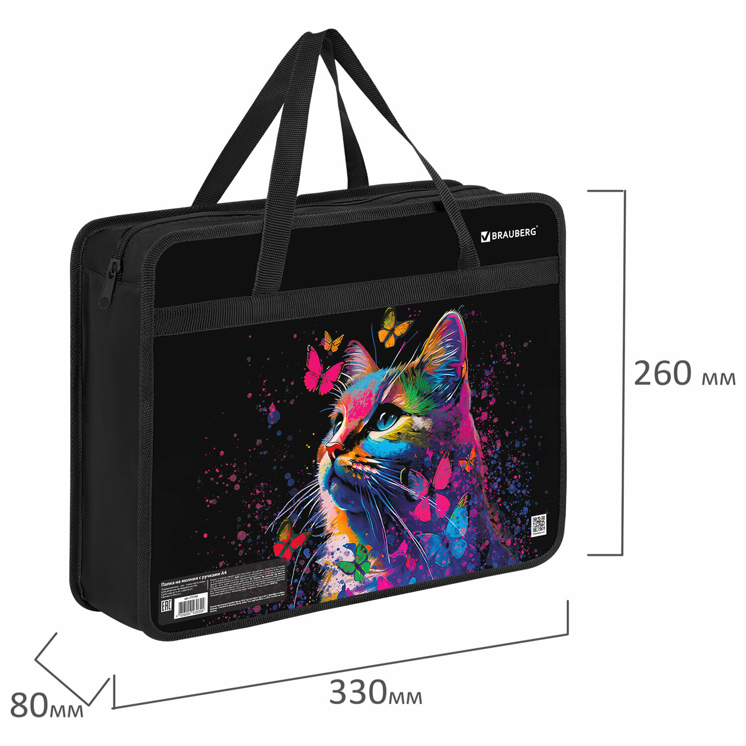Папка с ручками BRAUBERG А4, 1 отделение, пластик, молния сверху, 80 мм, Black Cat, 270122