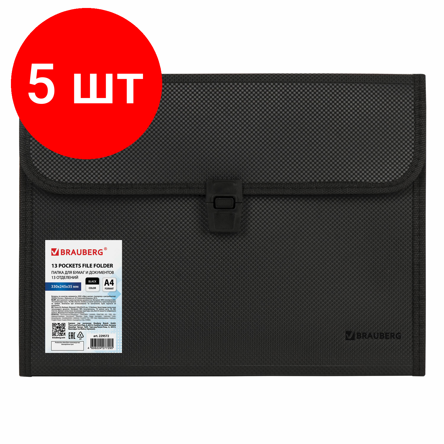 Купить Комплект 5 шт, Папка для бумаг и документов с замком и 13 отделениями BRAUBERG "HIT", А4, пластик, черная, 229572