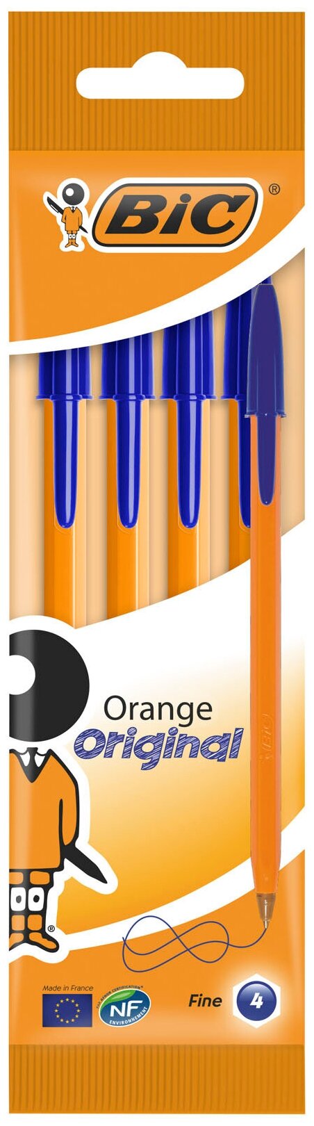 Купить Ручки шариковые BIC "Orange Original Fine", набор 4 шт., синие, узел 0,8 мм, линия письма 0,3 мм, пакет, 8308521
