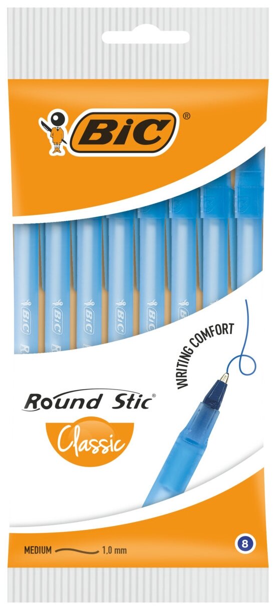 Ручка шариковая, чернила синие, 1.0 мм, среднее письмо, набор 8 штук, BIC Round Stic Classic