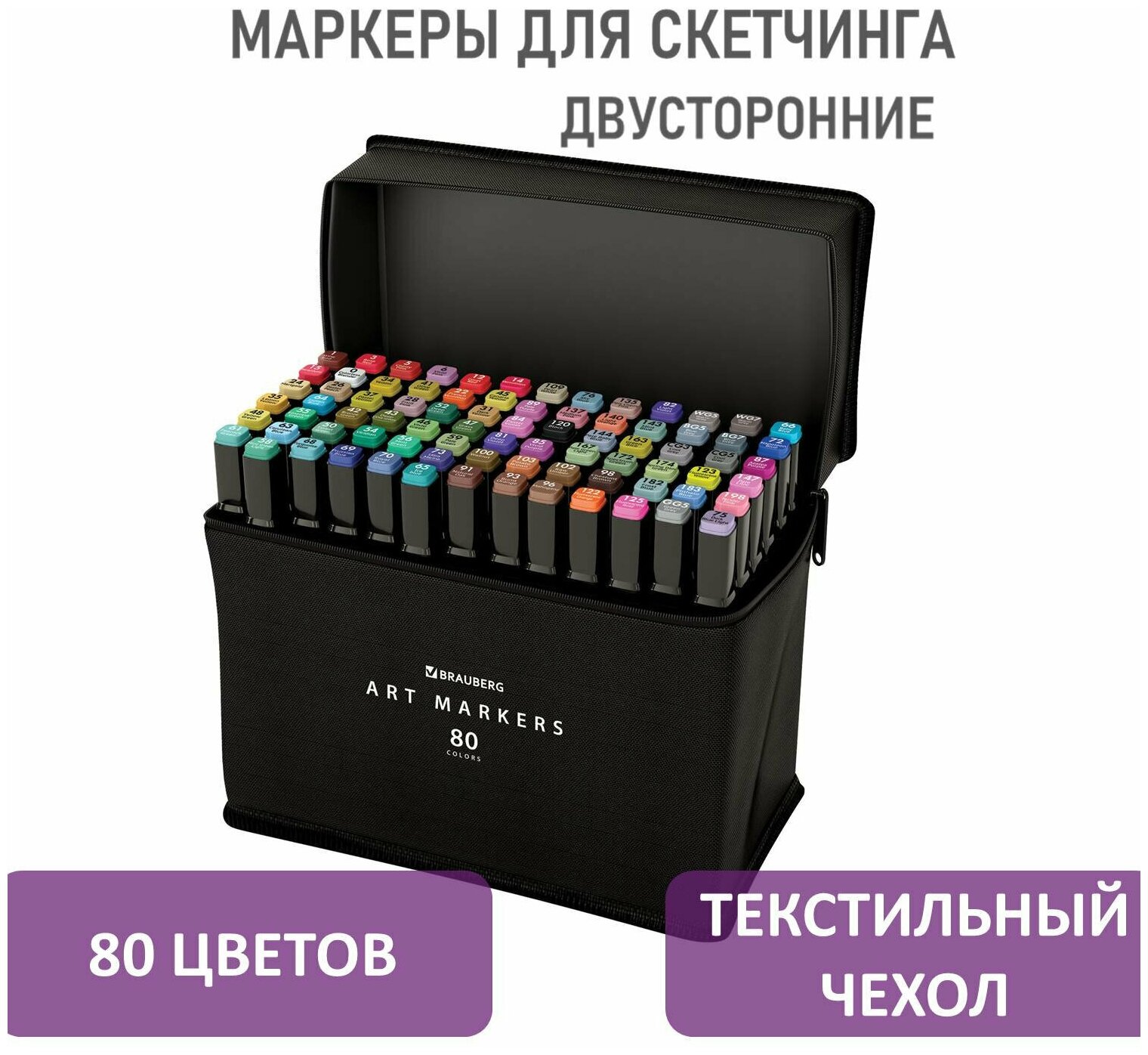 Маркеры для скетчинга Brauberg двусторонние, набор 80 шт., текстильный чехол, ART, 152233