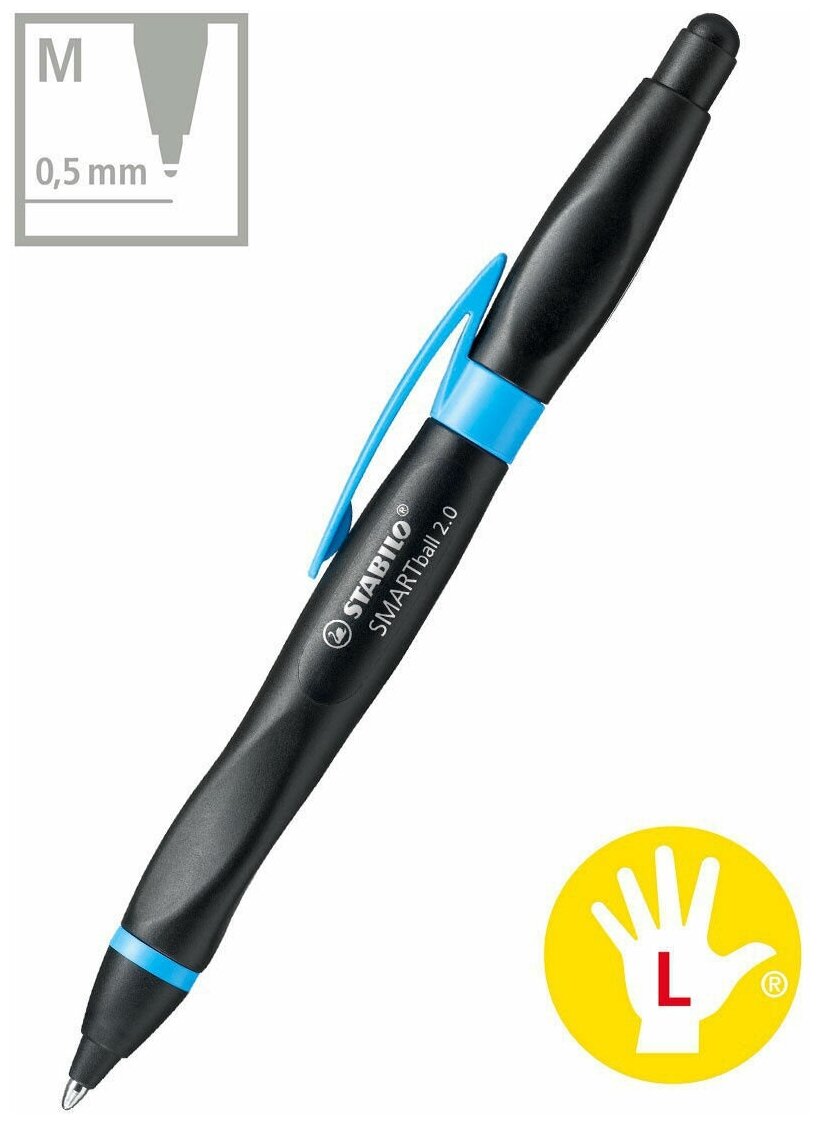 Ручка-стилус STABILO SMARTball 2.0 для левшей, корпус: черный/голубой, цвет чернил синий, 0,5мм интересное: