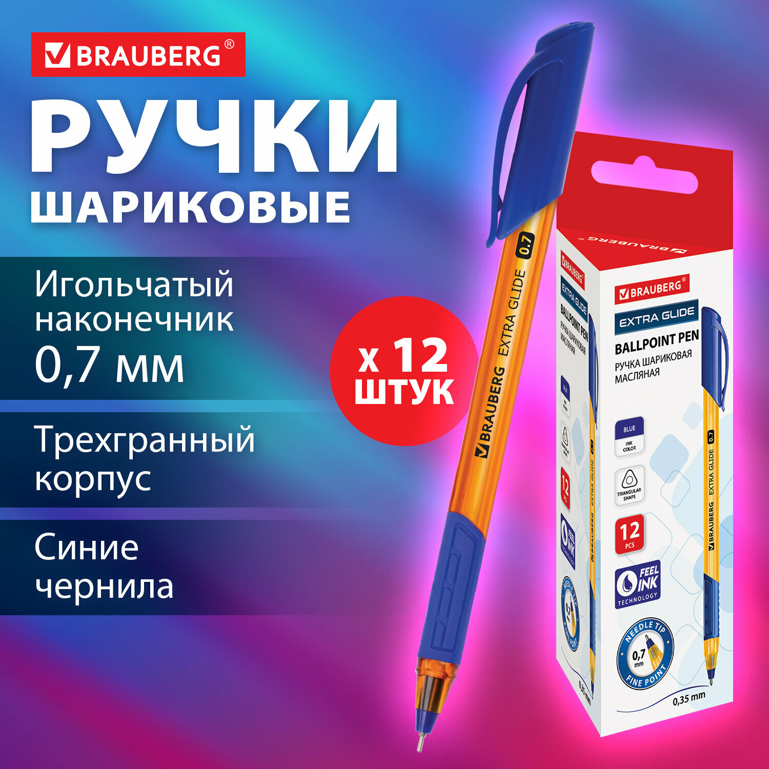 Ручка шариковая масляная с грипом BRAUBERG "Extra Glide GT", синяя, трехгранная, узел 0,7 мм, линия письма 0,35 мм, 12 шт