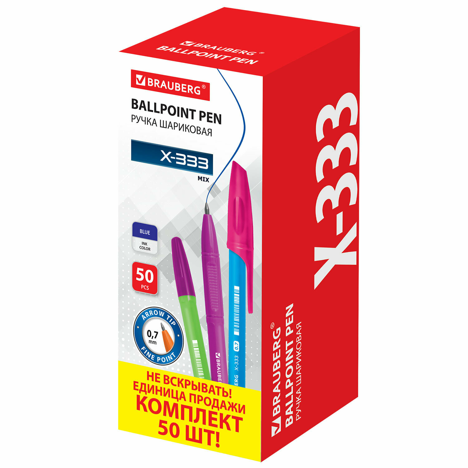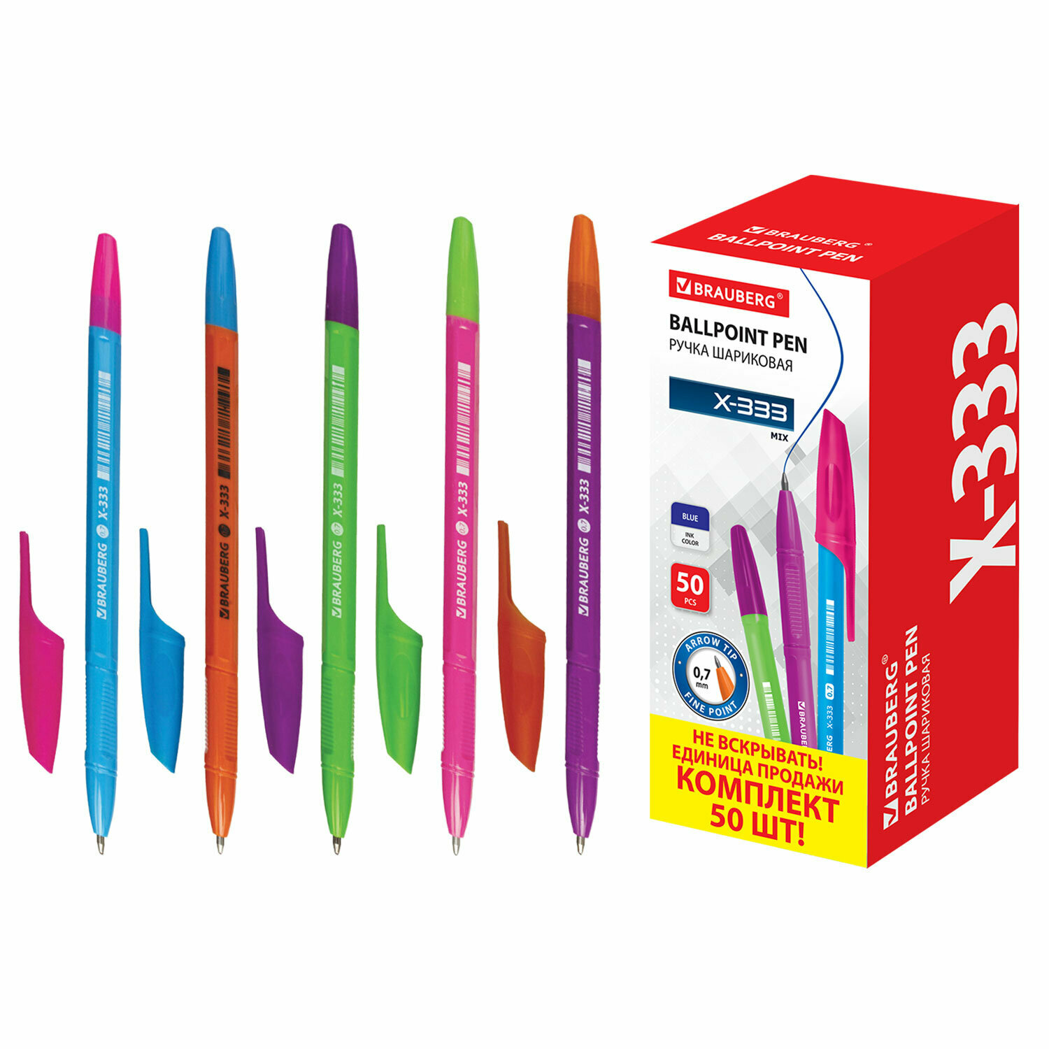 Купить Ручка шариковая BRAUBERG X-333 MIX, комплект 50 штук, синяя, корпус ассорти, узел 0,7мм, 880155