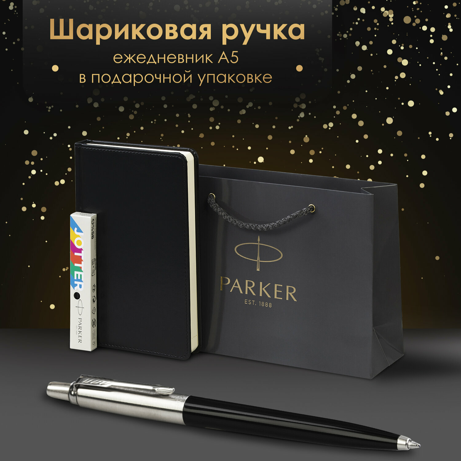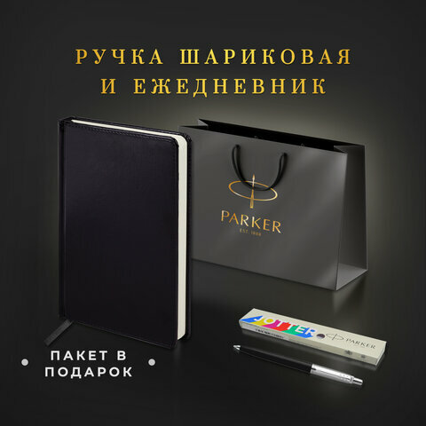 Ручка шариковая PARKER "Jotter Plastic CT", корпус черный, ежедневник А5 черный, золотой срез, пакет, 880894