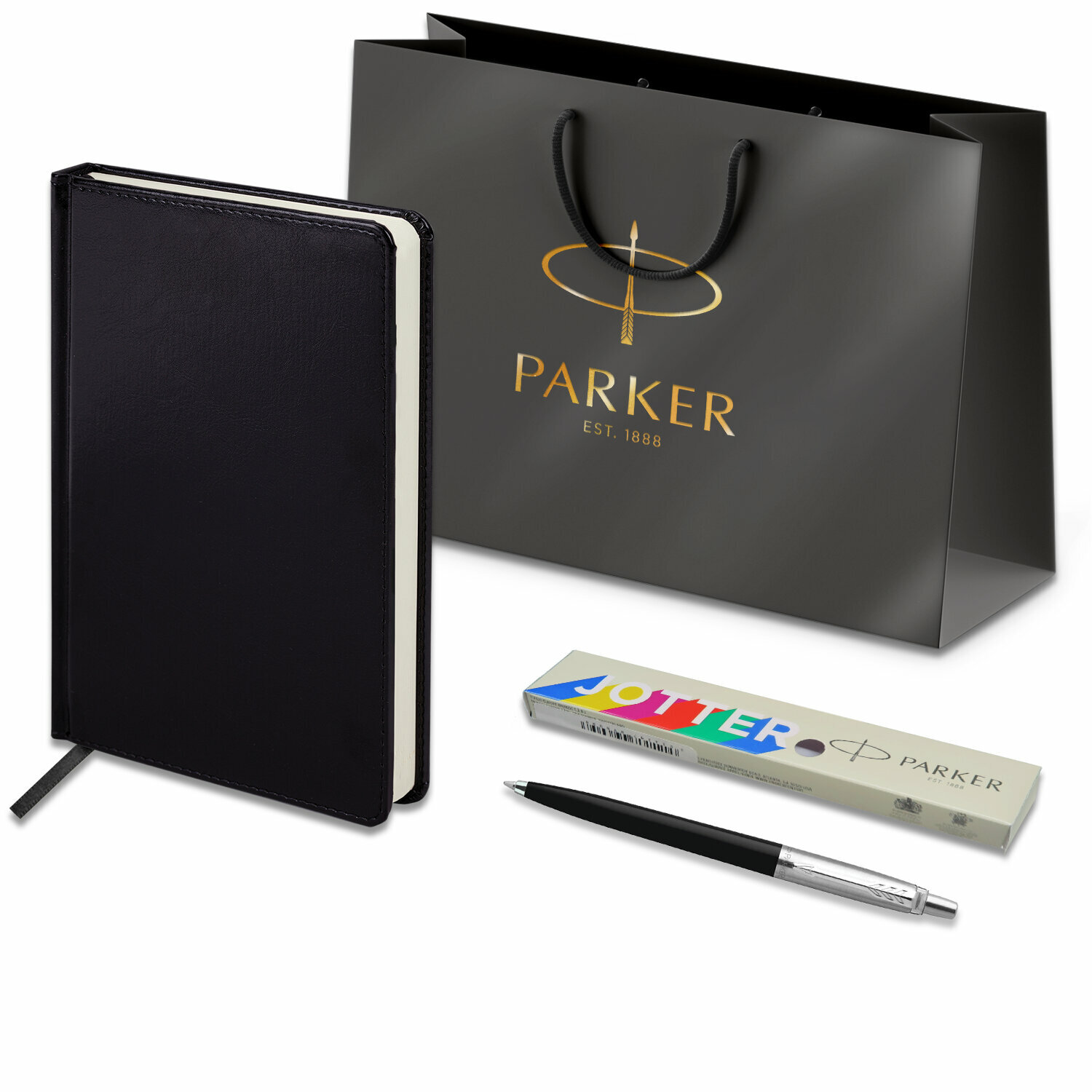 Купить Ручка шариковая PARKER "Jotter Plastic CT", корпус черный, ежедневник А5 черный, белый срез, пакет, 880895