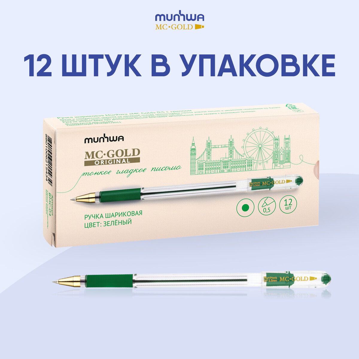 Ручка шариковая MunHwa MC Gold (0.5мм, зеленая, масляная основа), 12шт.