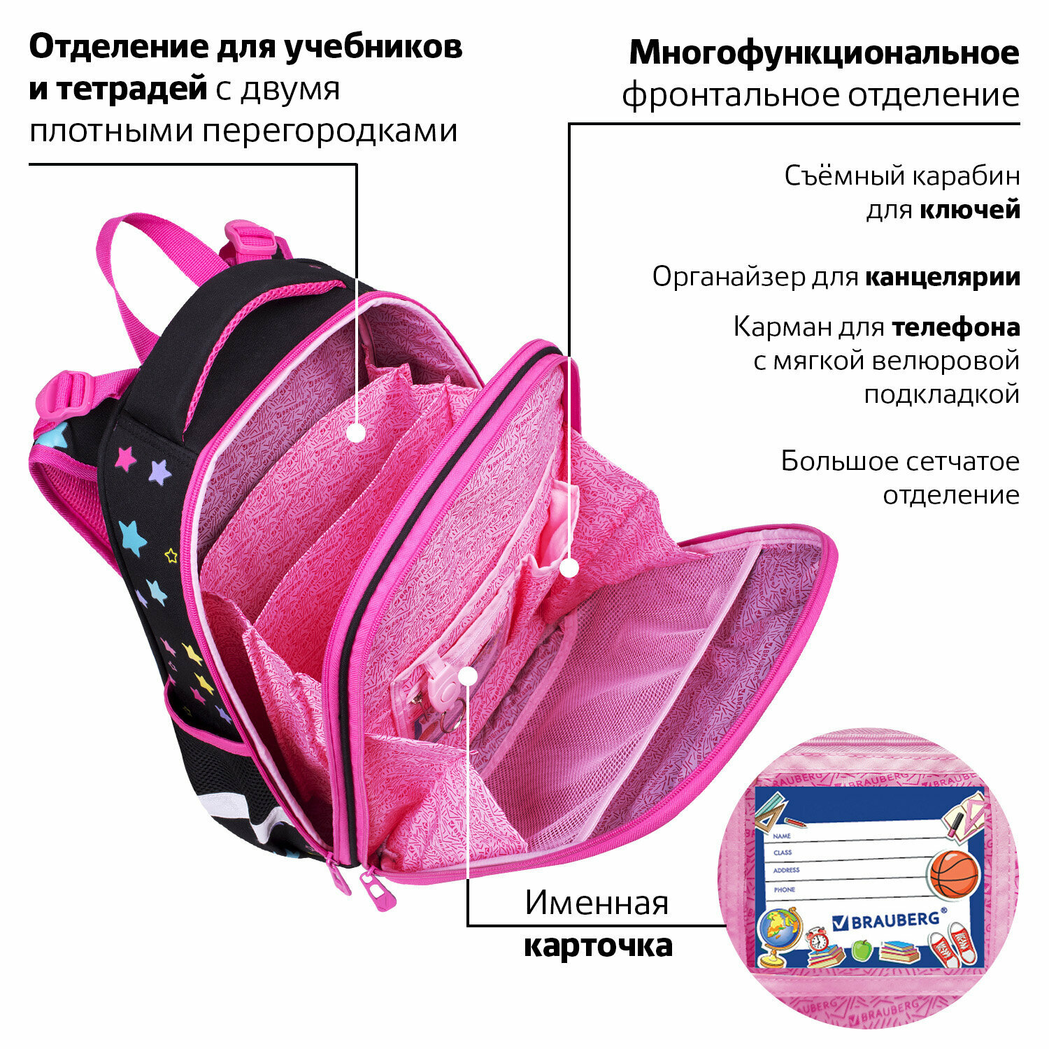 Рюкзак школьный для девочки, портфель для первоклассницы ортопедический, ранец детский в школу, 2 отделения, брелок, led-лампы, Brauberg Space sweet, 272020