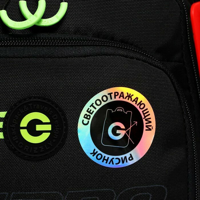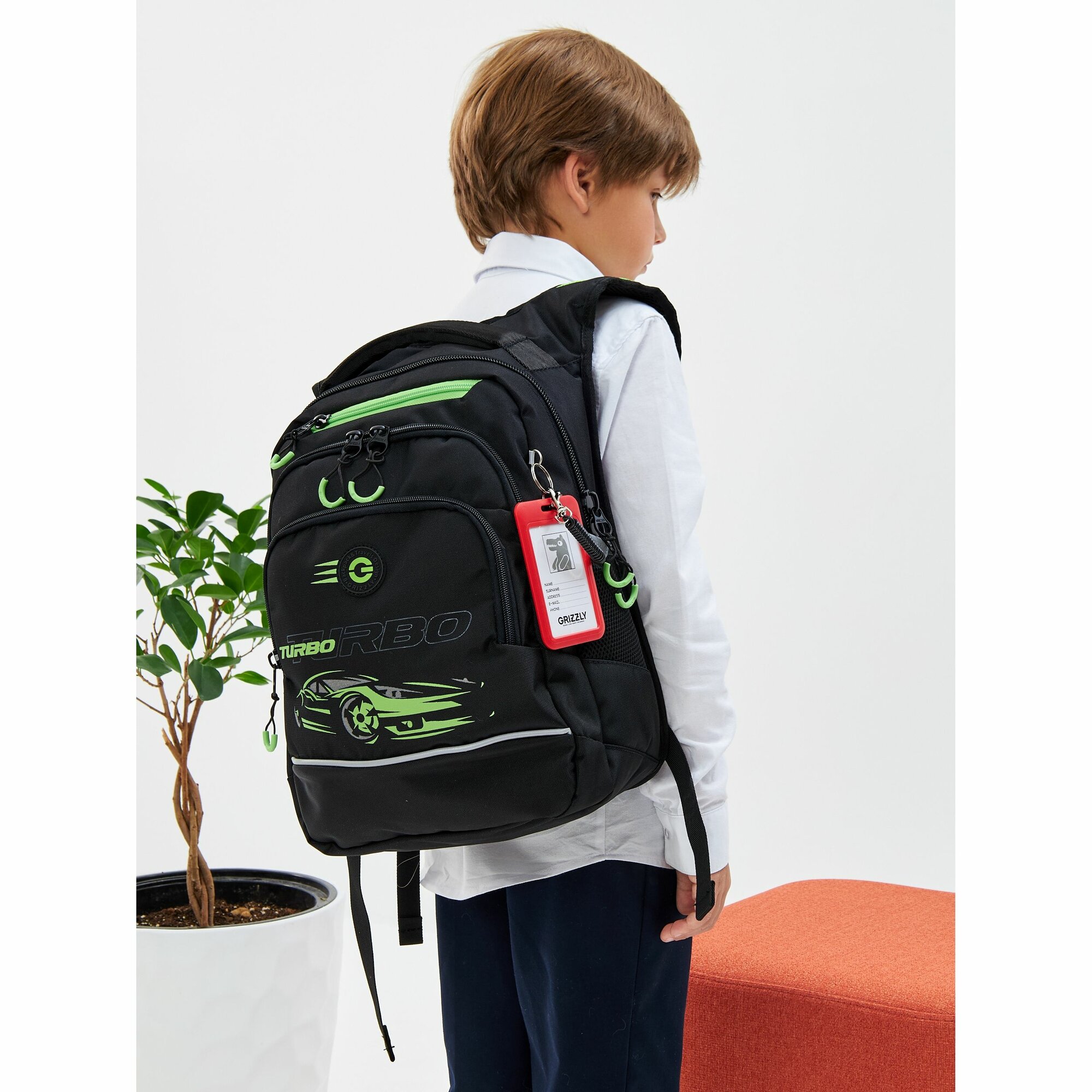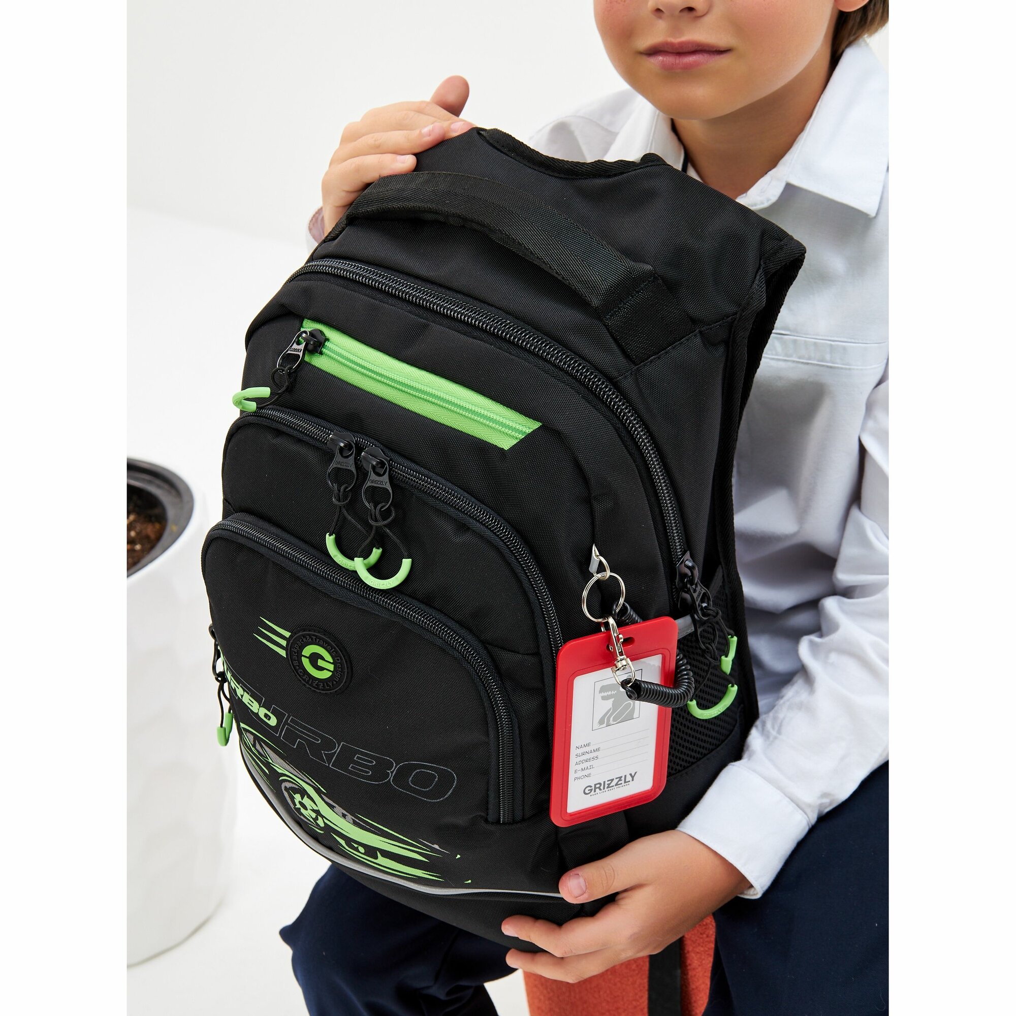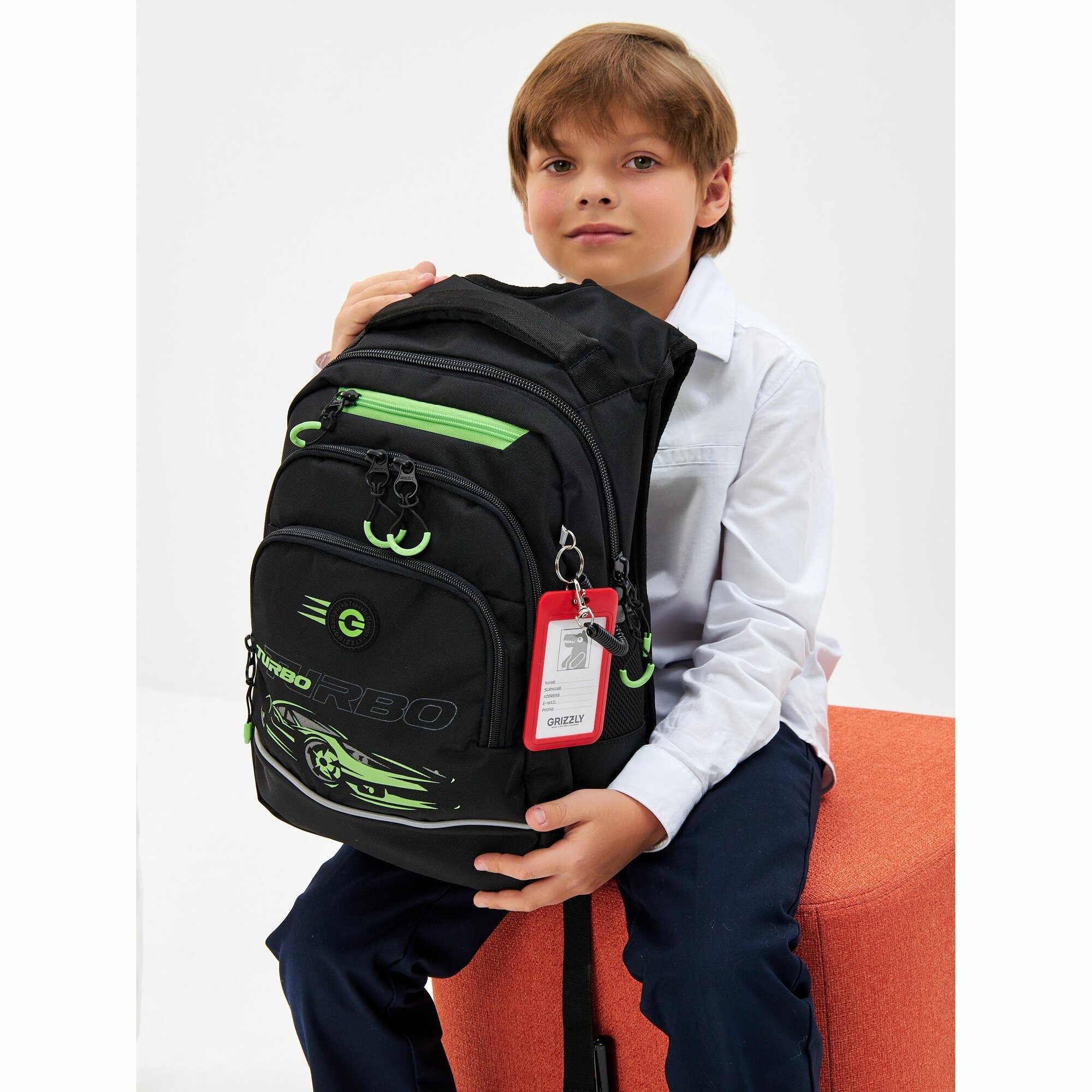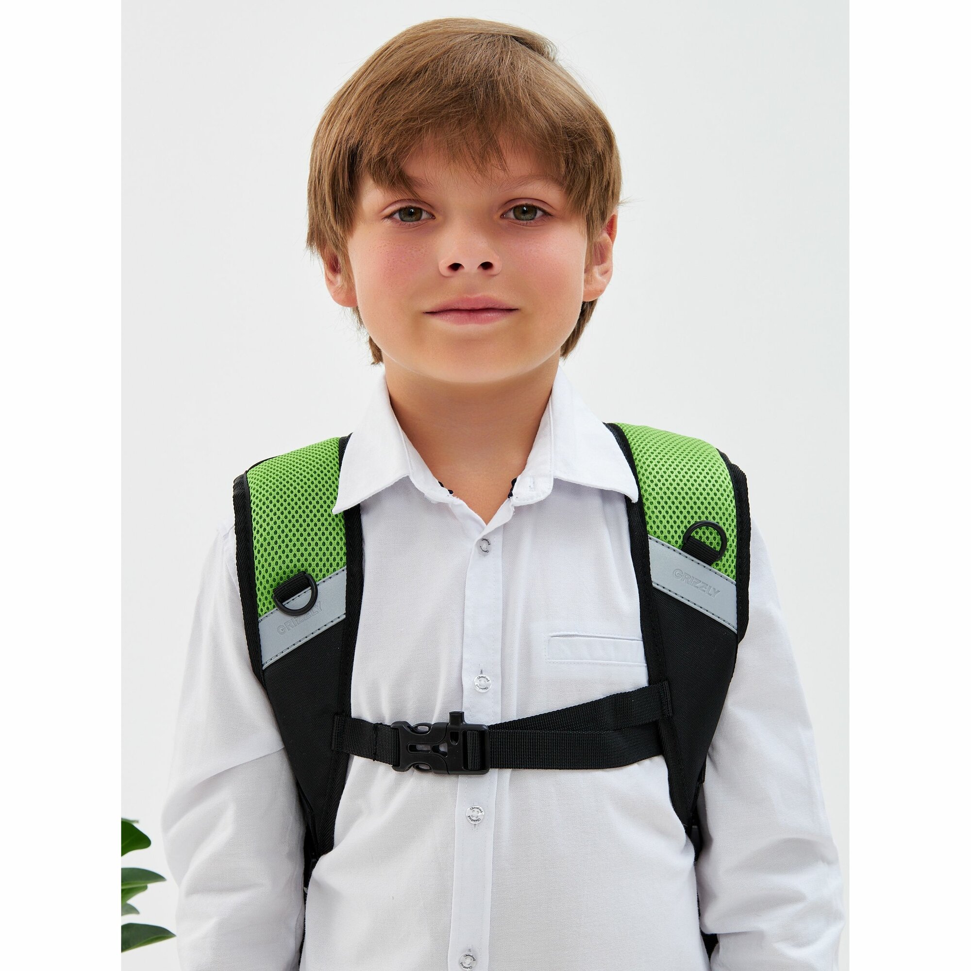 Школьный рюкзак с эргономичной спинкой GRIZZLY RB-450-1/3 черный - зеленый, грудная стяжка, 2 отделения, 636 грамм, 40x25x22см, 14.5л.