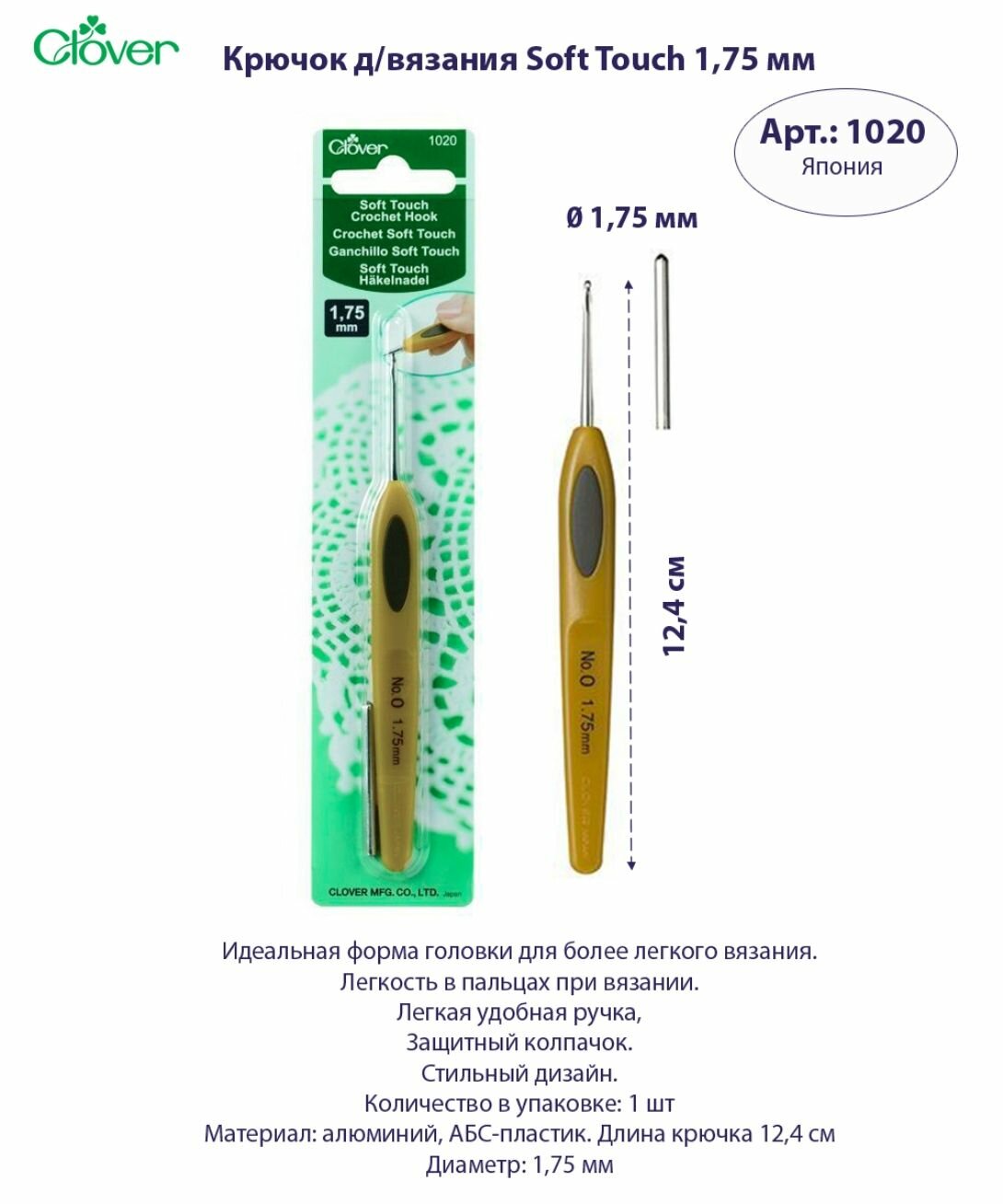 Крючок для вязания Clover Soft Touch, 1,0 мм