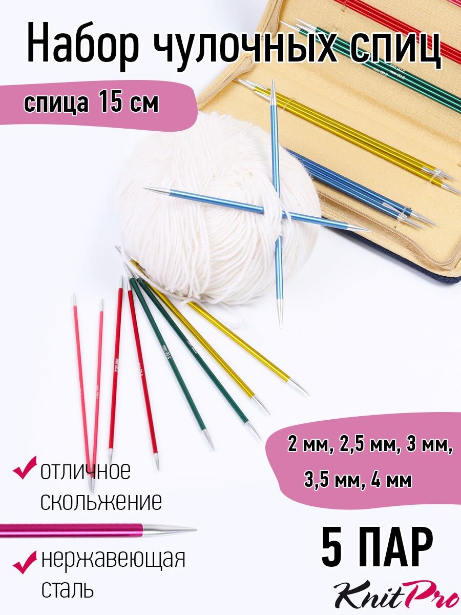 СохранитьНабор чулочных спиц длиной 15см "Zing" (в наборе: спицы чулочные-2мм, 2,5мм, 3мм, 3,5мм, 4мм), алюминий, 5 видов спиц в наборе, KnitPro, арт.47401 интересное: