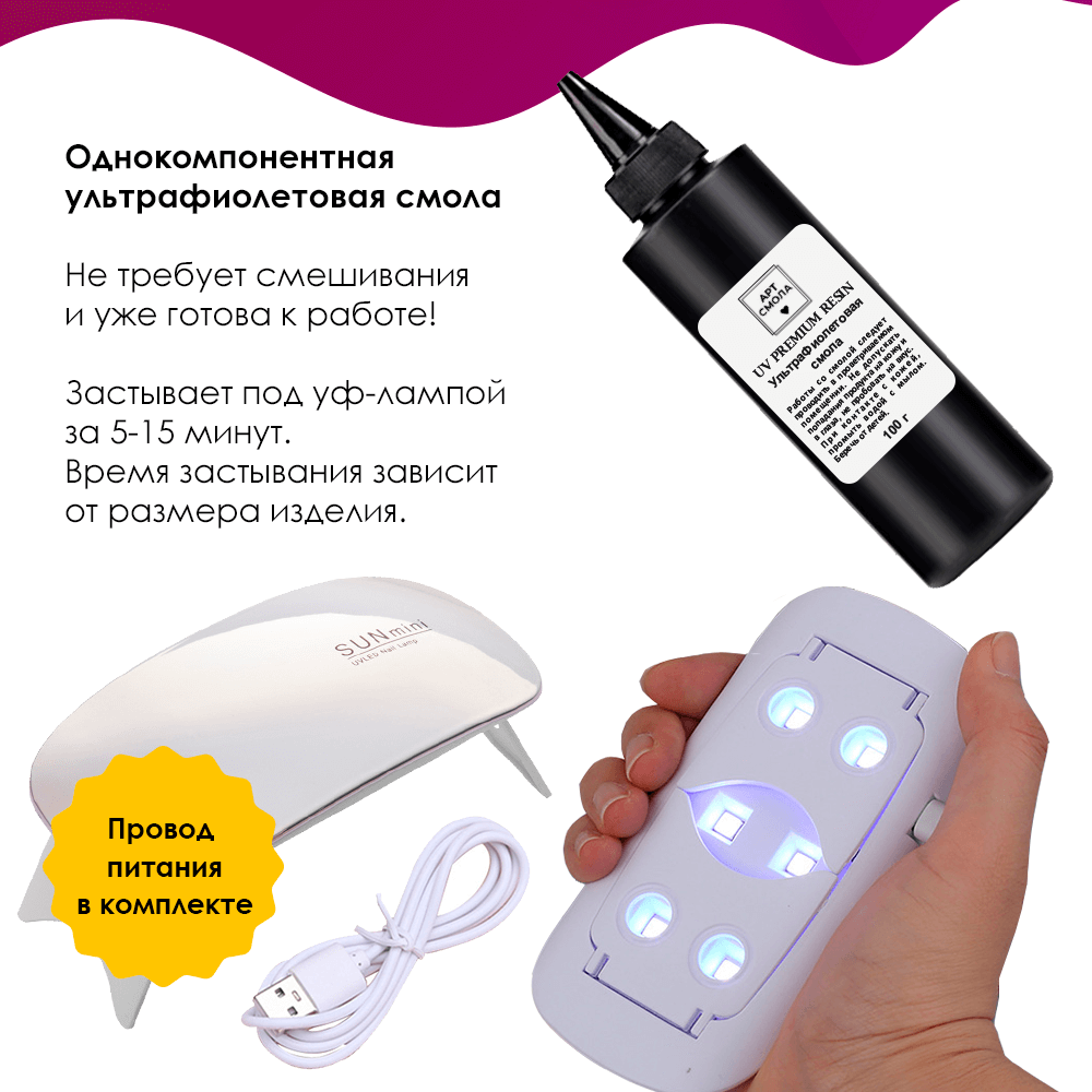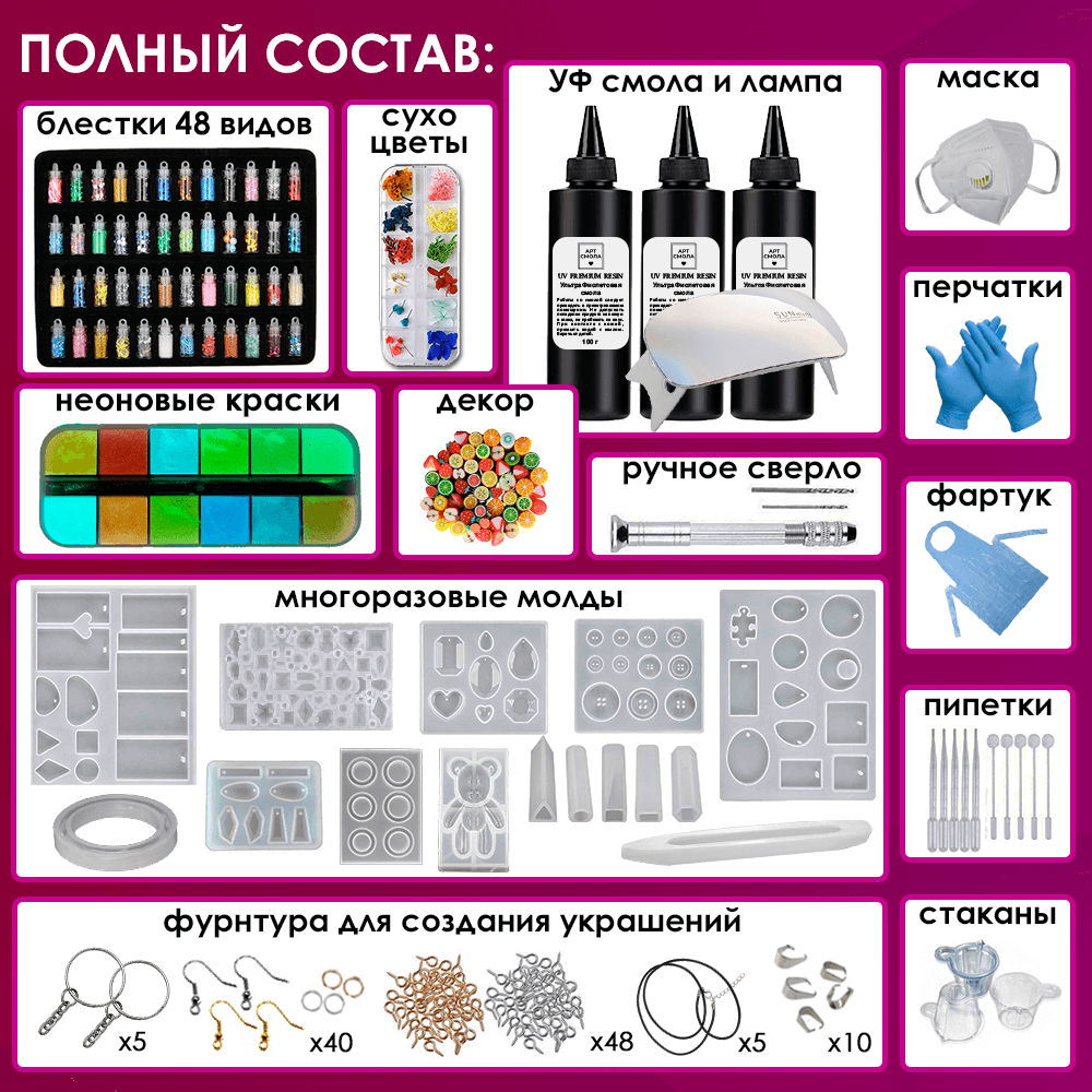 | Комплектация | UV смола для заливки 300 г (3 флакона по 100 грамм), УФ лампа для сушки и силиконовые молды формочки для эпоксидной смолы, ультрафиолетовые красители для эпоксидной смолы, сухоцветы, фурнитура для украшений, глиттер блестки, подарочная коробка |