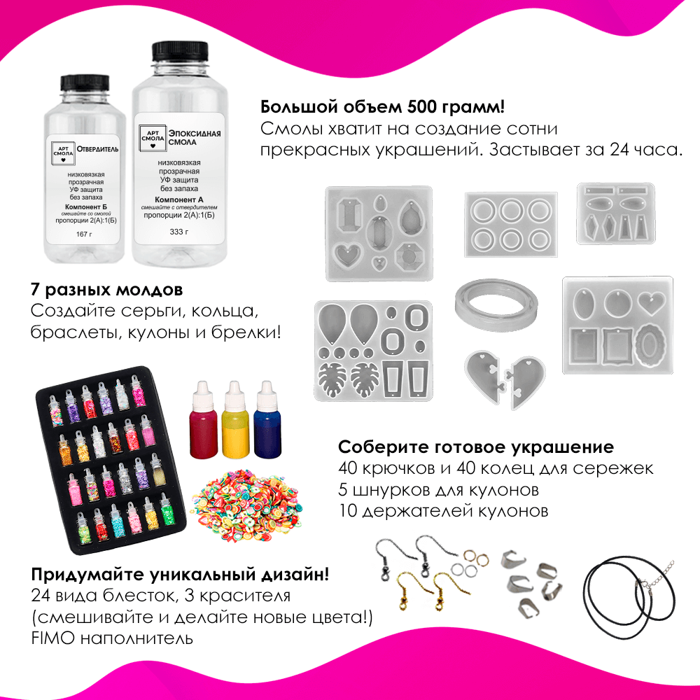 Эпоксидная смола для творчества. Набор для создания украшений (кольца, сережки, кулоны, браслет) из ювелирной смолы